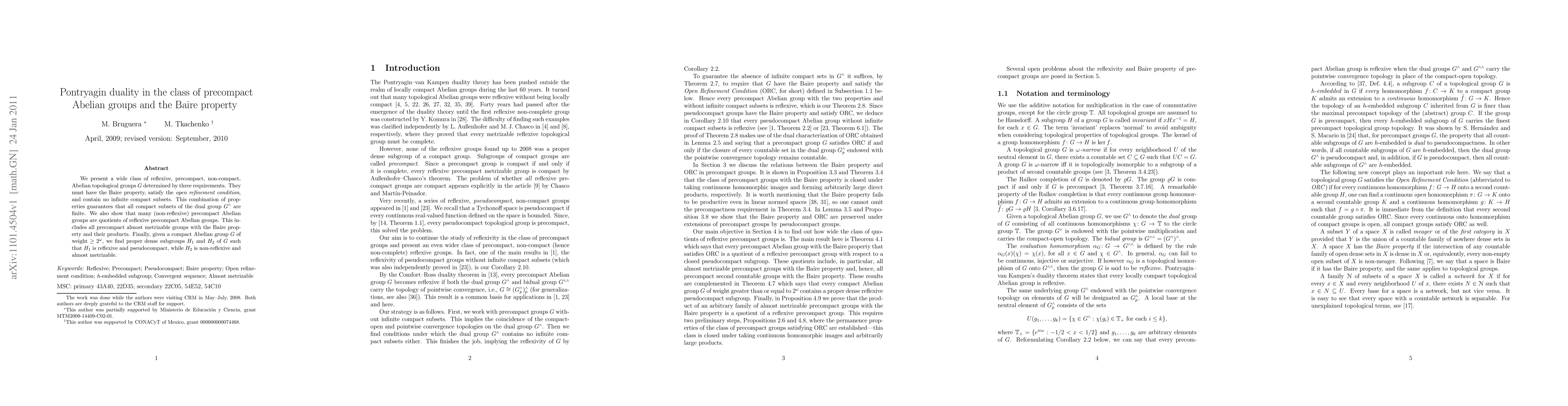 This paper explores reflexive, precompact, non-compact Abelian topological groups with the Baire property, demonstrating that their dual groups have only finite compact subsets. It also shows that many non-reflexive precompact Abelian groups are quotients of such reflexive groups.