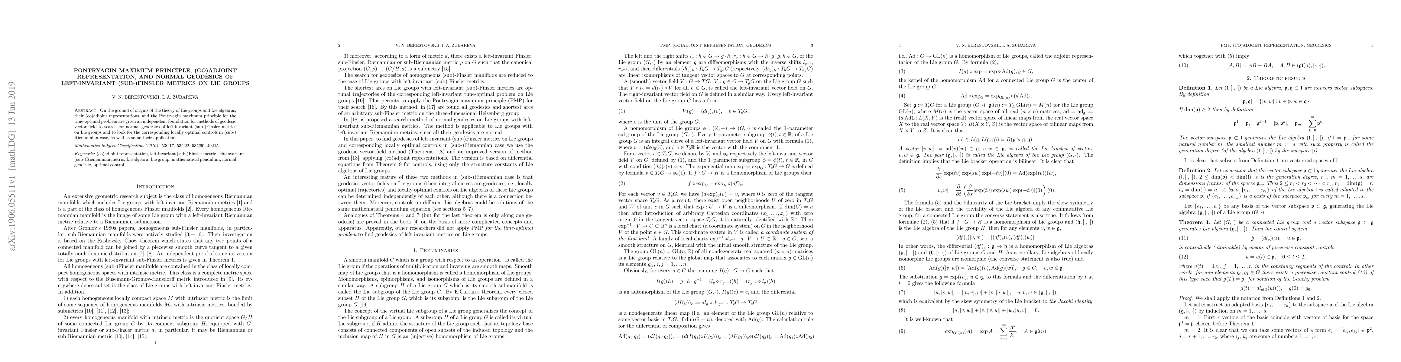 Summary: This paper applies the Pontryagin maximum principle and (co)adjoint representations to find normal geodesics of left-invariant (sub-)Finsler metrics on Lie groups, exploring optimal control solutions in the (sub-)Riemannian case and their applications.