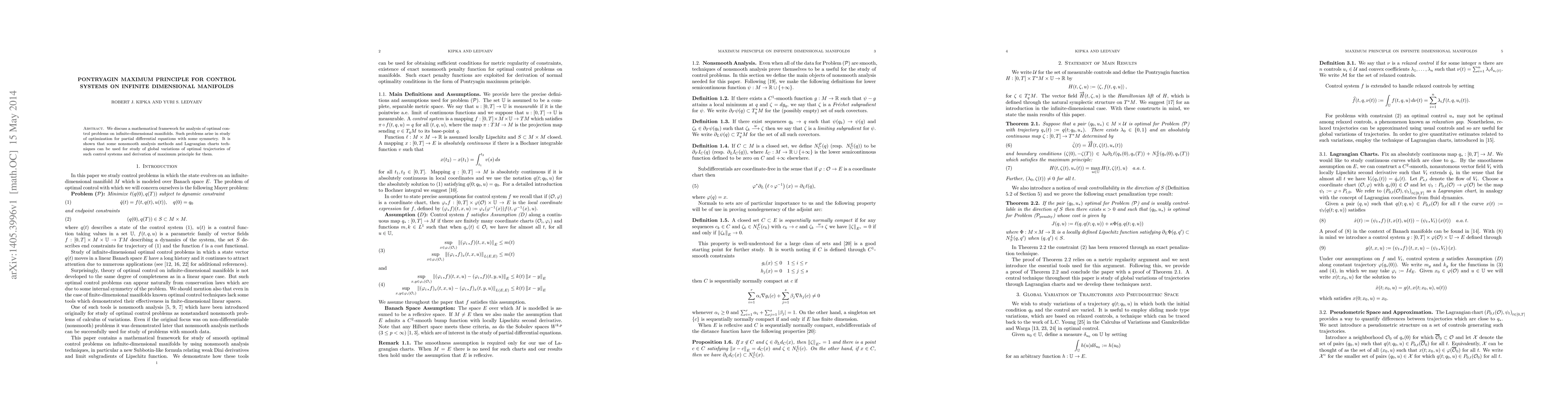 We discuss a mathematical framework for analysis of optimal control problems on infinite-dimensional manifolds. Such problems arise in study of optimization for partial differential equations with some symmetry. It is shown that some nonsmooth analysis methods and Lagrangian charts techniques can be used for study of global variations of optimal trajectories of such control systems and derivation of maximum principle for them.