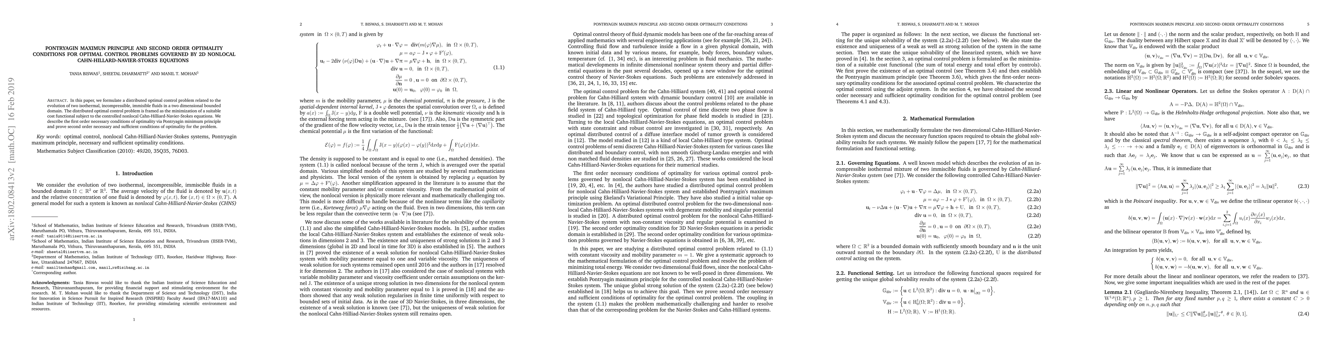 This paper formulates an optimal control problem for the evolution of two incompressible, immiscible fluids governed by nonlocal Cahn-Hilliard-Navier-Stokes equations, deriving first and second order optimality conditions using Pontryagin's maximum principle.