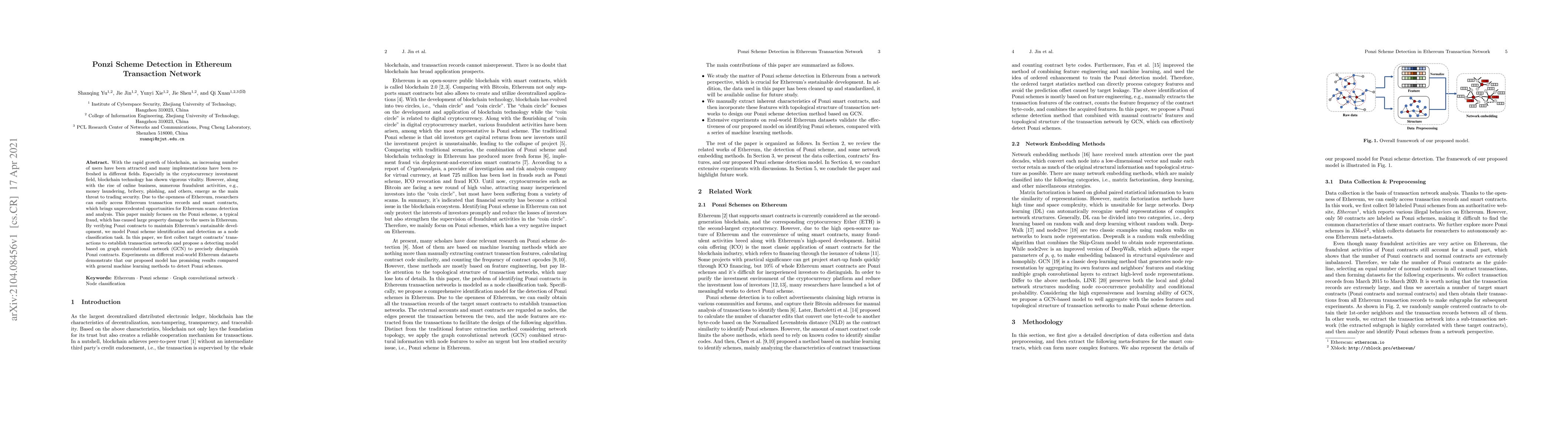 This paper proposes a method to detect Ponzi schemes in Ethereum using a graph convolutional network (GCN) to classify suspicious contracts. The model analyzes Ethereum transaction networks and outperforms traditional machine learning methods in identifying fraudulent Ponzi schemes.