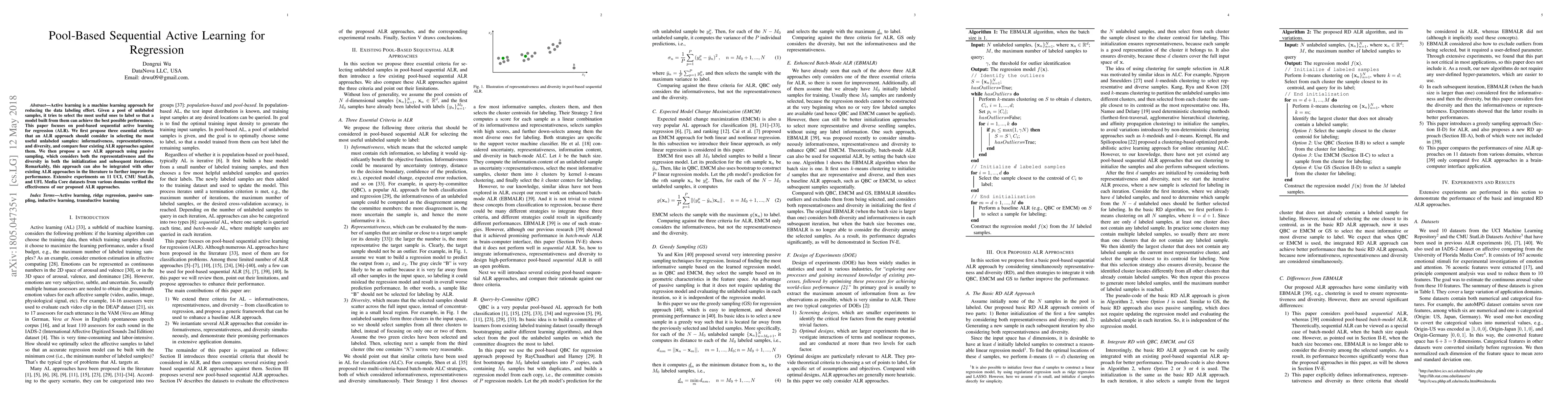 Active learning is a machine learning approach for reducing the data labeling effort. Given a pool of unlabeled samples, it tries to select the most useful ones to label so that a model built from them can achieve the best possible performance. This paper focuses on pool-based sequential active learning for regression (ALR). We first propose three essential criteria that an ALR approach should consider in selecting the most useful unlabeled samples: informativeness, representativeness, and diversity, and compare four existing ALR approaches against them. We then propose a new ALR approach using passive sampling, which considers both the representativeness and the diversity in both the initialization and subsequent iterations. Remarkably, this approach can also be integrated with other existing ALR approaches in the literature to further improve the performance. Extensive experiments on 11 UCI, CMU StatLib, and UFL Media Core datasets from various domains verified the effectiveness of our proposed ALR approaches.