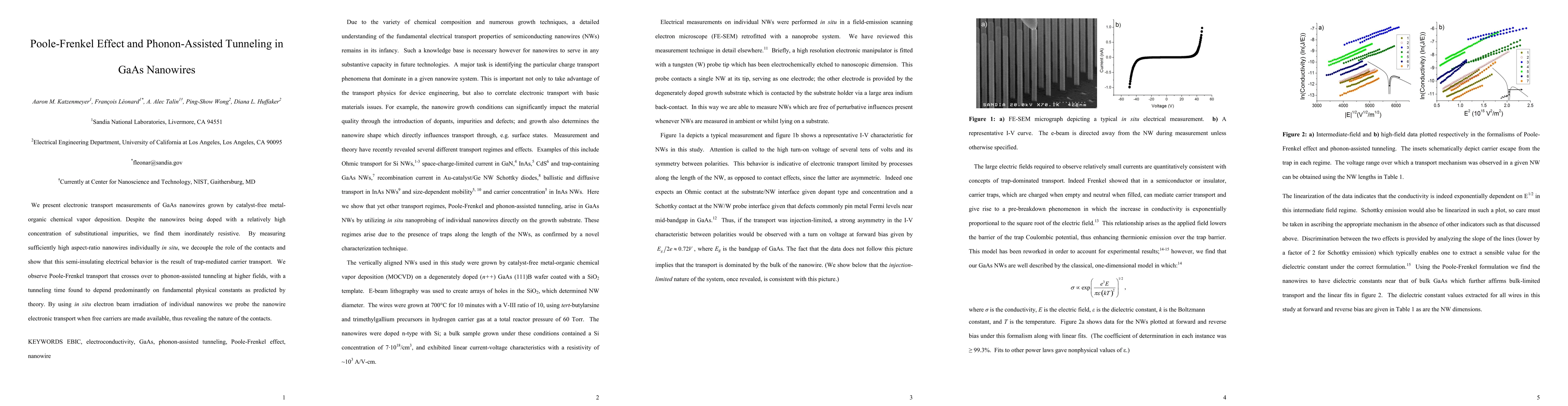 This study investigates the electronic transport in GaAs nanowires, revealing semi-insulating behavior due to trap-mediated carrier transport. The researchers observe Poole-Frenkel effect transitioning to phonon-assisted tunneling at higher fields, with tunneling time dependent on fundamental physical constants.