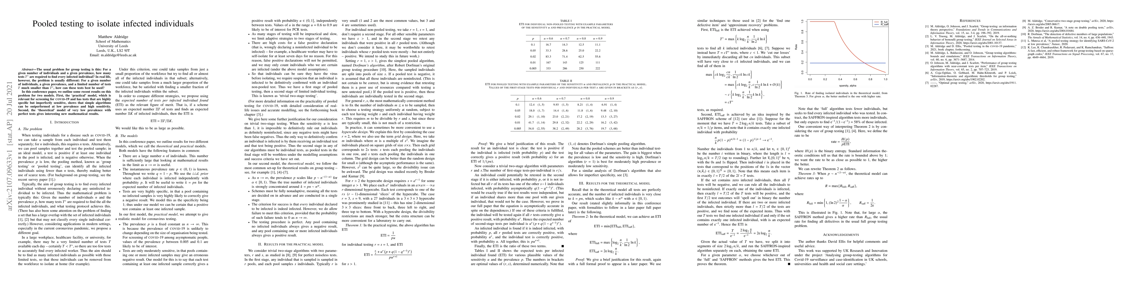 The usual problem for group testing is this: For a given number of individuals and a given prevalence, how many tests T* are required to find every infected individual? In real life, however, the problem is usually different: For a given number of individuals, a given prevalence, and a limited number of tests T much smaller than T*, how can these tests best be used? In this conference paper, we outline some recent results on this problem for two models. First, the "practical" model, which is relevant for screening for COVID-19 and has tests that are highly specific but imperfectly sensitive, shows that simple algorithms can be outperformed at low prevalence and high sensitivity. Second, the "theoretical" model of very low prevalence with perfect tests gives interesting new mathematical results.