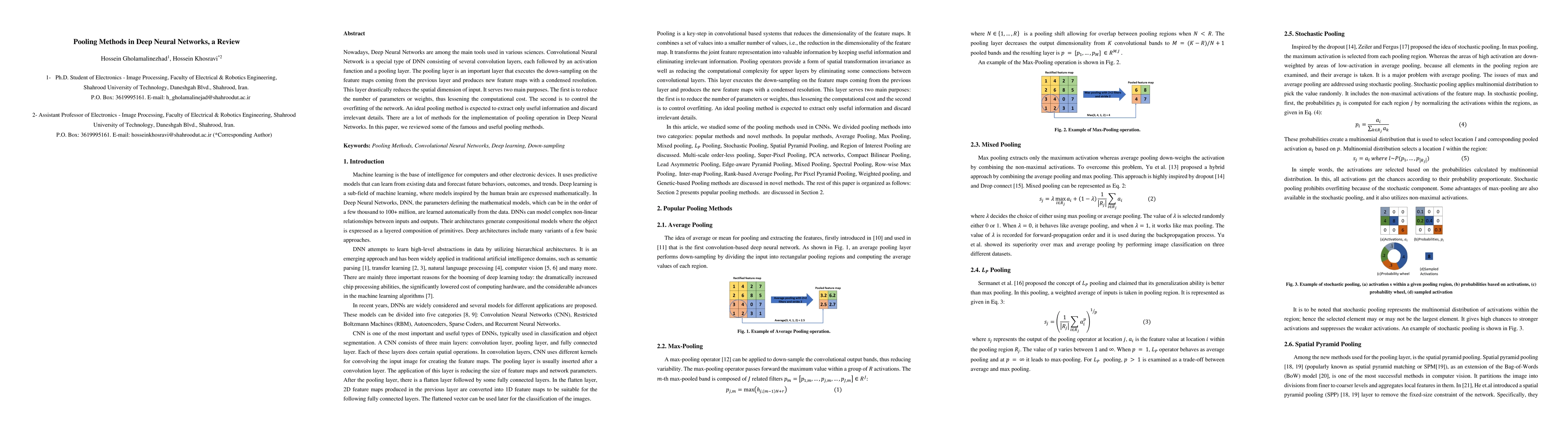 Nowadays, Deep Neural Networks are among the main tools used in various sciences. Convolutional Neural Network is a special type of DNN consisting of several convolution layers, each followed by an activation function and a pooling layer. The pooling layer is an important layer that executes the down-sampling on the feature maps coming from the previous layer and produces new feature maps with a condensed resolution. This layer drastically reduces the spatial dimension of input. It serves two main purposes. The first is to reduce the number of parameters or weights, thus lessening the computational cost. The second is to control the overfitting of the network. An ideal pooling method is expected to extract only useful information and discard irrelevant details. There are a lot of methods for the implementation of pooling operation in Deep Neural Networks. In this paper, we reviewed some of the famous and useful pooling methods.