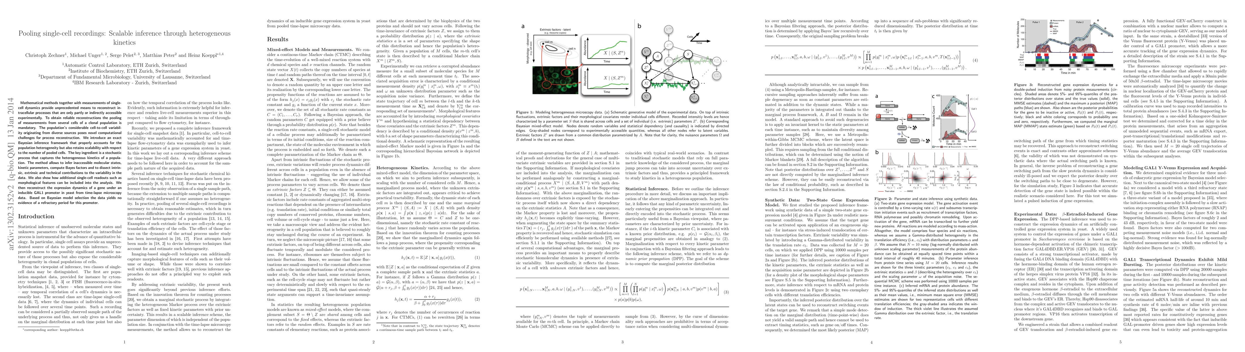 Mathematical methods together with measurements of single-cell dynamics provide unprecedented means to reconstruct intracellular processes that are only partly or indirectly accessible experimentally. To obtain reliable reconstructions the pooling of measurements from several cells of a clonal population is mandatory. The population's considerable cell-to-cell variability originating from diverse sources poses novel computational challenges for process reconstruction. We introduce an exact Bayesian inference framework that properly accounts for the population heterogeneity but also retains scalability with respect to the number of pooled cells. The key ingredient is a stochastic process that captures the heterogeneous kinetics of a population. The method allows to infer inaccessible molecular states, kinetic parameters, compute Bayes factors and to dissect intrinsic, extrinsic and technical contributions to the variability in the data. We also show how additional single-cell readouts such as morphological features can be included into the analysis. We then reconstruct the expression dynamics of a gene under an inducible GAL1 promoter in yeast from time-lapse microscopy data. Based on Bayesian model selection the data yields no evidence of a refractory period for this promoter.