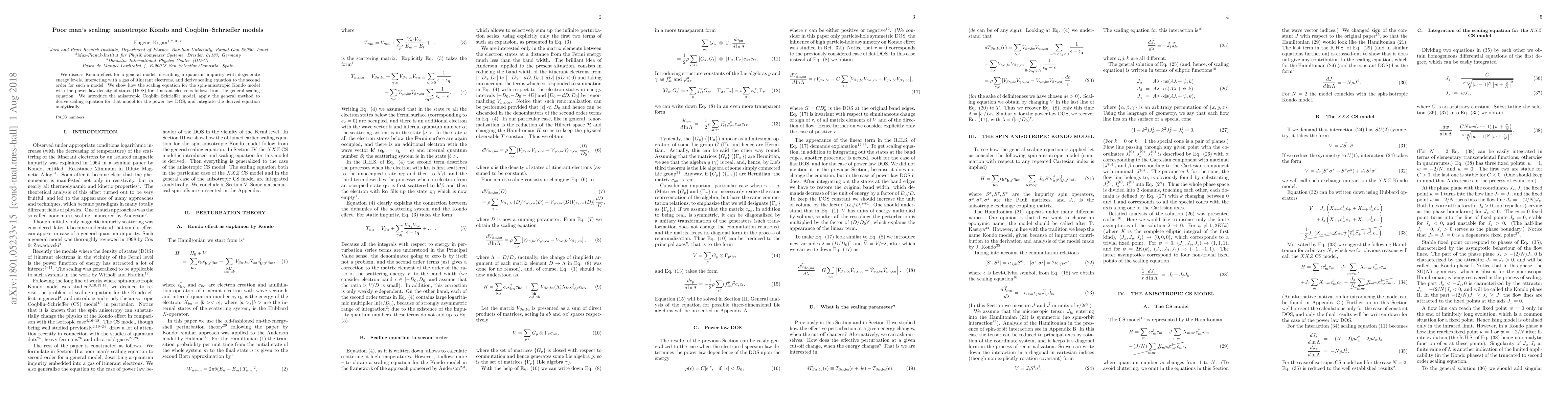 We discuss Kondo effect for a general model, describing a quantum impurity with degenerate energy levels, interacting with a gas of itinerant electrons, and derive scaling equation to the second order for such a model. We show how the scaling equation for the spin-anisotropic Kondo model with the power law density of states (DOS) for itinerant electrons follows from the general scaling equation. We introduce the anisotropic Coqblin--Schrieffer model, apply the general method to derive scaling equation for that model for the power law DOS, and integrate the derived equation analytically.
