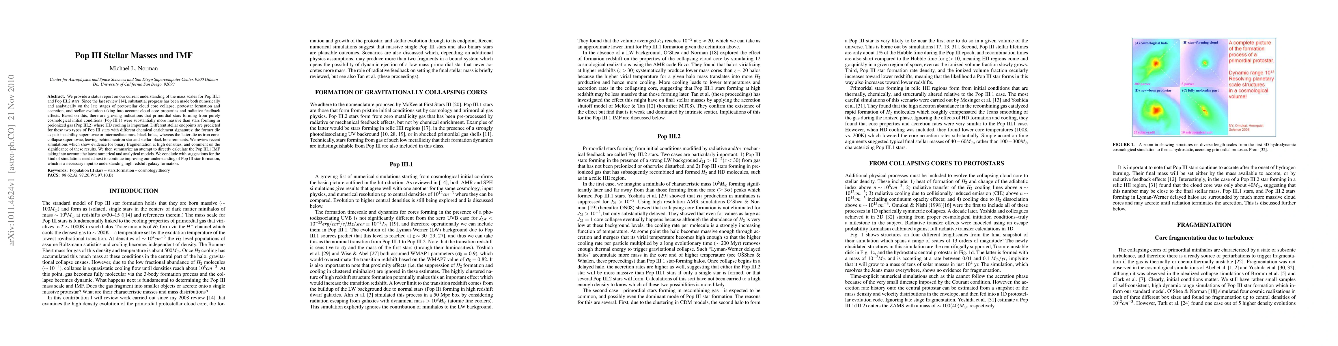 We provide a status report on our current understanding of the mass scales for Pop III.1 and Pop III.2 stars. Since the last review (Norman 2008), substantial progress has been made both numerically and analytically on the late stages of protostellar cloud core collapse, protostar formation and accretion, and stellar evolution taking into account cloud core properties and radiative feedback effects. Based on this, there are growing indications that primordial stars forming from purely cosmological initial conditions (Pop III.1) were substantially more massive than stars forming in preionized gas (Pop III.2) where HD cooling is important. Different stellar endpoints are predicted for these two types of Pop III stars with different chemical enrichment signatures: the former die as pair instability supernovae or intermediate mass black holes, whereas the latter die as iron core-collapse supernovae, leaving behind neutron star and stellar black hole remnants. We review recent simulations which show evidence for binary fragmentation at high densities, and comment on the significance of these results. We then summarize an attempt to directly calculate the Pop III.1 IMF taking into account the latest numerical and analytical models. We conclude with suggestions for the kind of simulations needed next to continue improving our understanding of Pop III star formation, which is a necessary input to understanding high redshift galaxy formation.