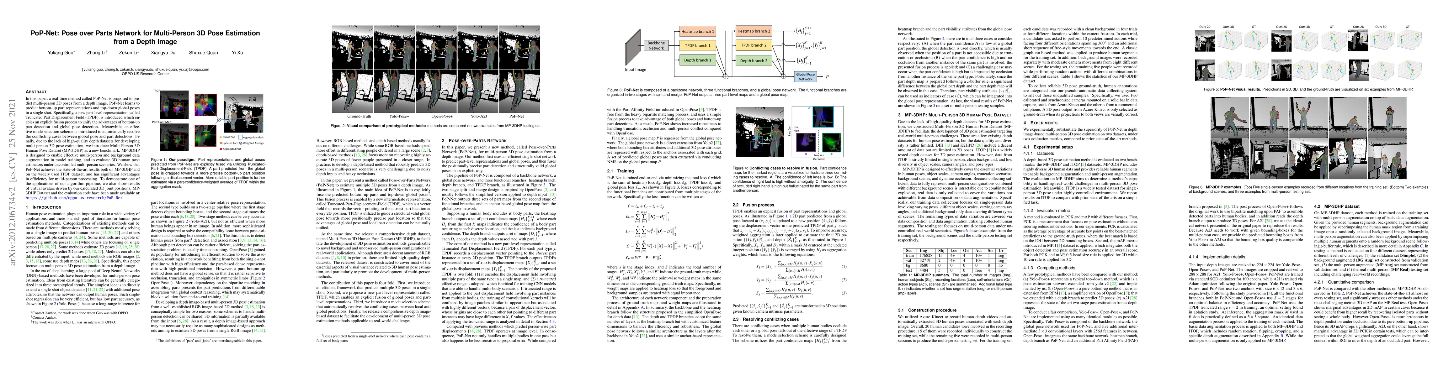 PoP-Net is a real-time method for predicting multi-person 3D poses from depth images by fusing part-level and global pose representations. It introduces the Truncated Part Displacement Field and a mode selection scheme for conflict resolution, achieving state-of-the-art results on MP-3DHP and ITOP datasets.