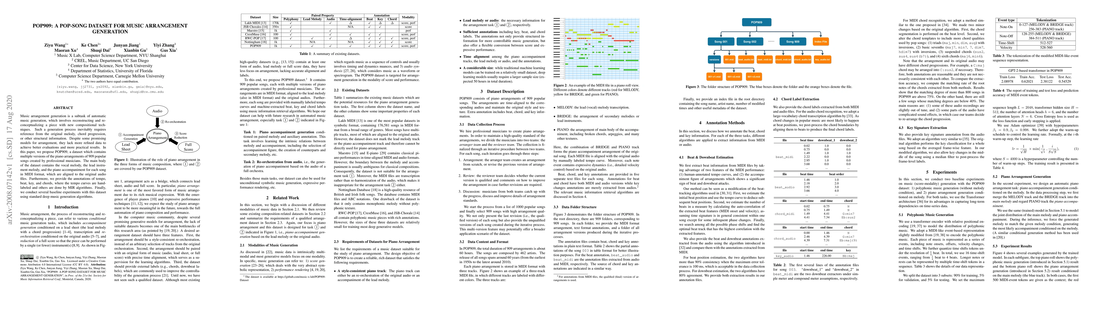 This paper introduces POP909, a dataset comprising multiple piano arrangements of 909 popular songs by professionals, aimed at enhancing music arrangement generation models. The dataset includes MIDI files for vocal, lead instrument, and piano accompaniment, along with annotations for tempo, beat, key, and chords, and is used to conduct baseline experiments with deep music generation algorithms.