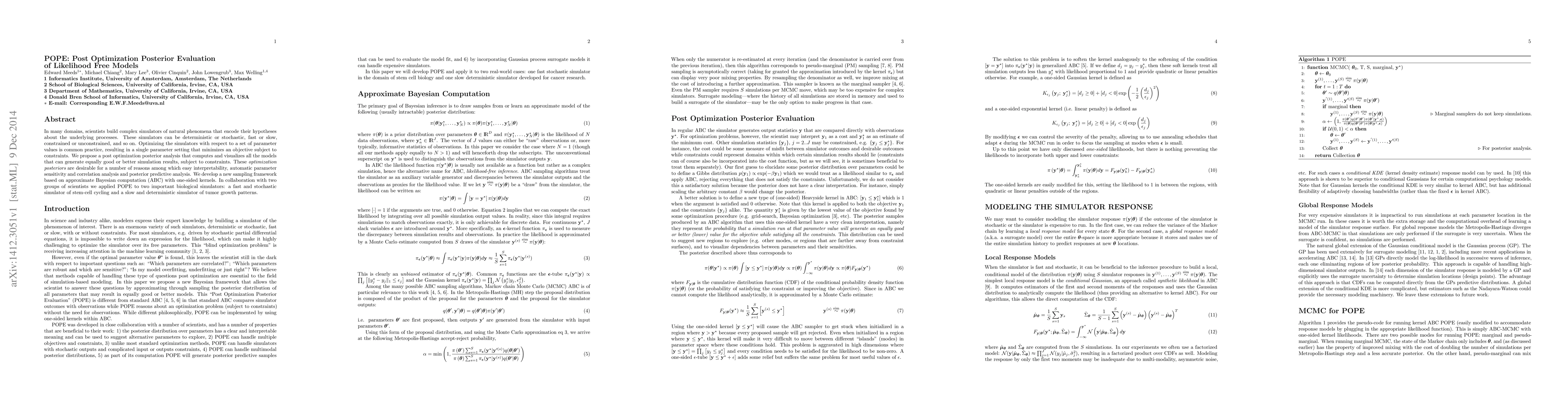 In many domains, scientists build complex simulators of natural phenomena that encode their hypotheses about the underlying processes. These simulators can be deterministic or stochastic, fast or slow, constrained or unconstrained, and so on. Optimizing the simulators with respect to a set of parameter values is common practice, resulting in a single parameter setting that minimizes an objective subject to constraints. We propose a post optimization posterior analysis that computes and visualizes all the models that can generate equally good or better simulation results, subject to constraints. These optimization posteriors are desirable for a number of reasons among which easy interpretability, automatic parameter sensitivity and correlation analysis and posterior predictive analysis. We develop a new sampling framework based on approximate Bayesian computation (ABC) with one-sided kernels. In collaboration with two groups of scientists we applied POPE to two important biological simulators: a fast and stochastic simulator of stem-cell cycling and a slow and deterministic simulator of tumor growth patterns.