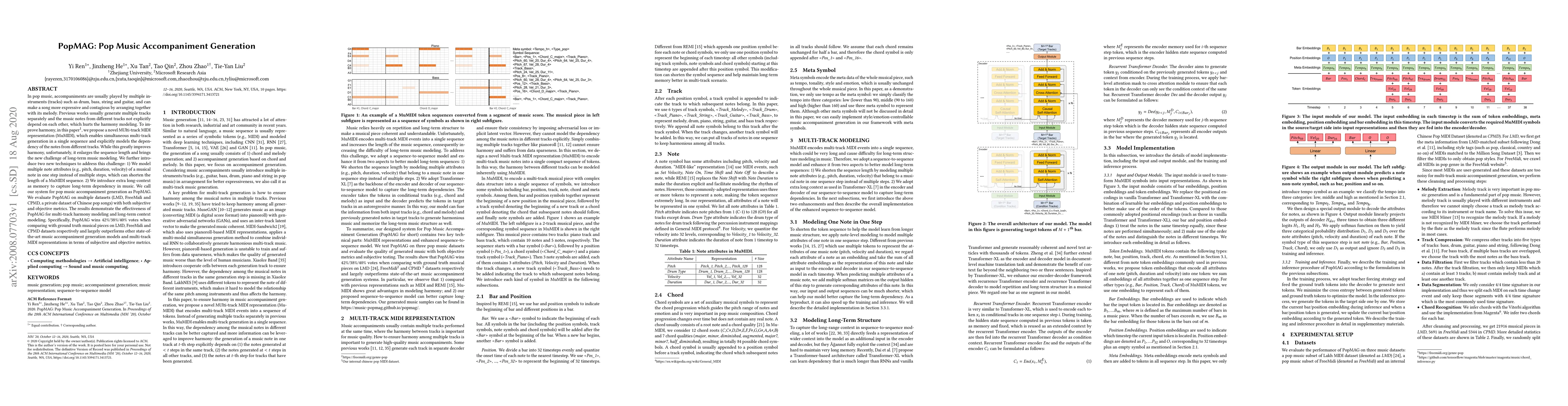 PopMAG proposes a novel MUlti-track MIDI representation (MuMIDI) for generating harmonious pop music accompaniments by modeling interdependencies between tracks in a single sequence. To address the challenge of long-term modeling, it introduces techniques to model multiple note attributes in one step and uses extra long-context memory, achieving superior performance over other models.