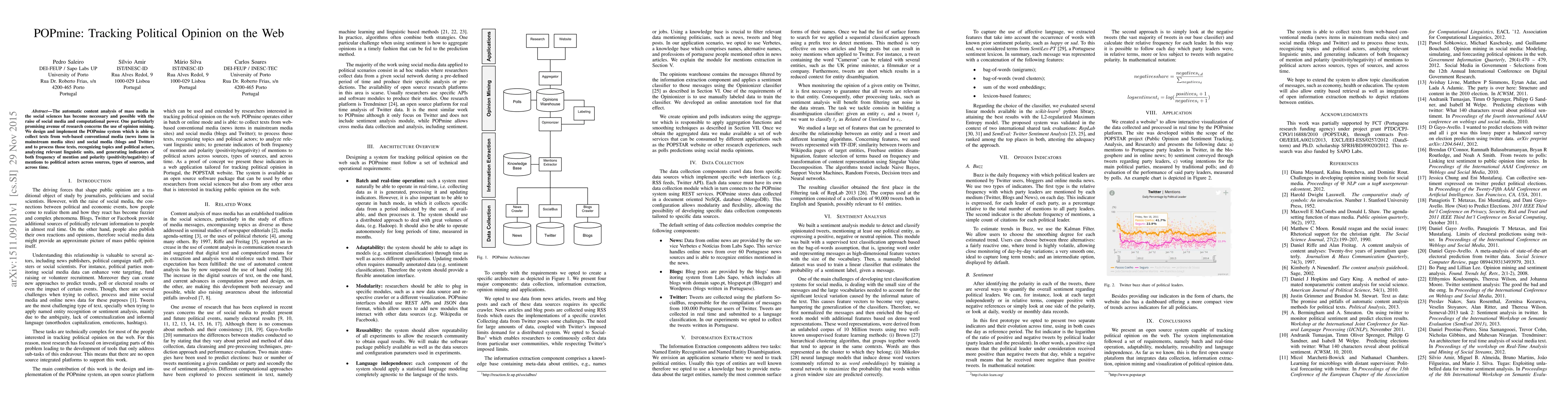 The POPmine system automates the analysis of political opinions from web-based conventional and social media, identifying topics, political actors, and generating indicators of mention frequency and sentiment polarity over time. This tool facilitates the study of political discourse in the digital age.