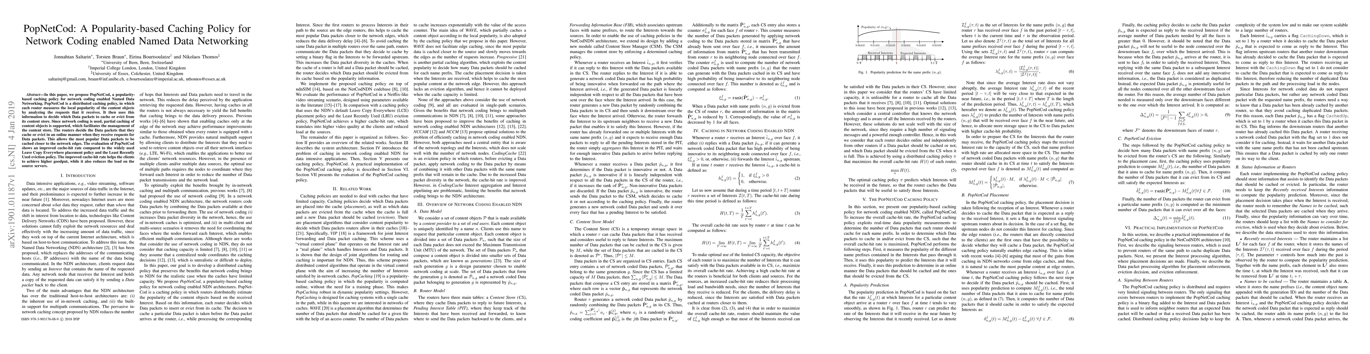 PopNetCod is a distributed caching policy for network coding enabled Named Data Networking that uses local popularity metrics to manage content caching. It improves cache-hit rates and reduces source server load compared to traditional caching methods.