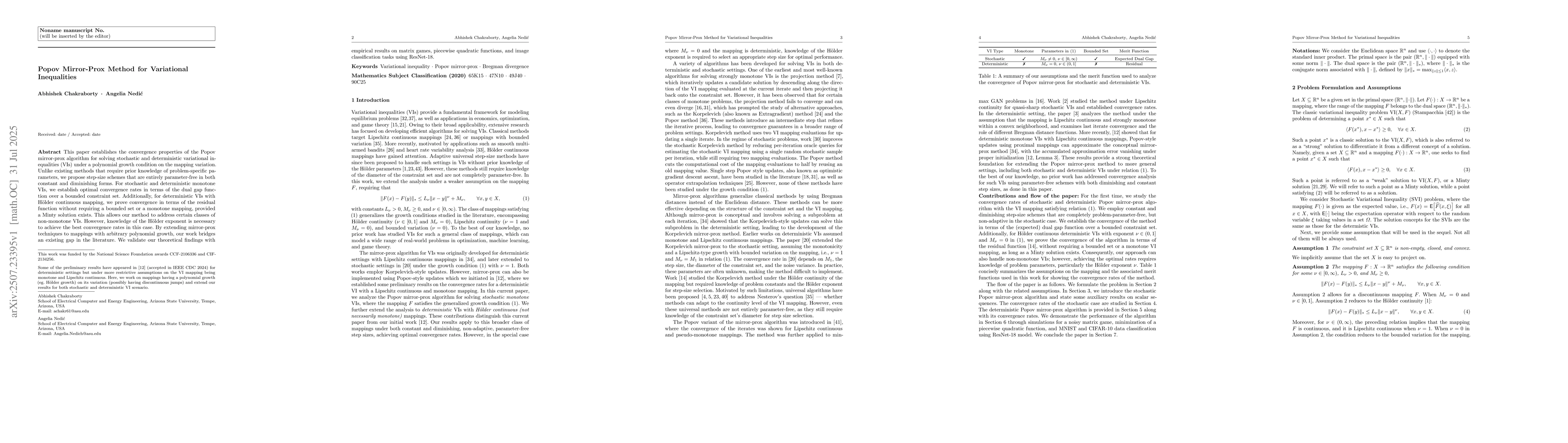 This paper establishes the convergence properties of the Popov mirror-prox algorithm for solving stochastic and deterministic variational inequalities (VIs) under a polynomial growth condition on the mapping variation. Unlike existing methods that require prior knowledge of problem-specific parameters, we propose step-size schemes that are entirely parameter-free in both constant and diminishing forms. For stochastic and deterministic monotone VIs, we establish optimal convergence rates in terms of the dual gap function over a bounded constraint set. Additionally, for deterministic VIs with H\"older continuous mapping, we prove convergence in terms of the residual function without requiring a bounded set or a monotone mapping, provided a Minty solution exists. This allows our method to address certain classes of non-monotone VIs. However, knowledge of the H\"older exponent is necessary to achieve the best convergence rates in this case. By extending mirror-prox techniques to mappings with arbitrary polynomial growth, our work bridges an existing gap in the literature. We validate our theoretical findings with empirical results on matrix games, piecewise quadratic functions, and image classification tasks using ResNet-18.
