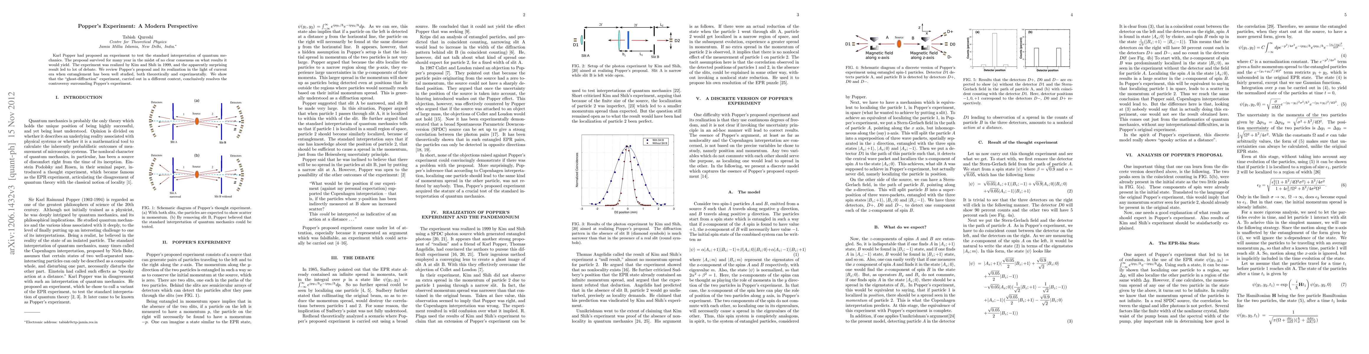 Karl Popper had proposed an experiment to test the standard interpretation of quantum mechanics. The proposal survived for many year in the midst of no clear consensus on what results it would yield. The experiment was realized by Kim and Shih in 1999, and the apparently surprising result led to lot of debate. We review Popper's proposal and its realization in the light of current era when entanglement has been well studied, both theoretically and experimentally. We show that the "ghost-diffraction" experiment, carried out in a different context, conclusively resolves the controversy surrounding Popper's experiment.