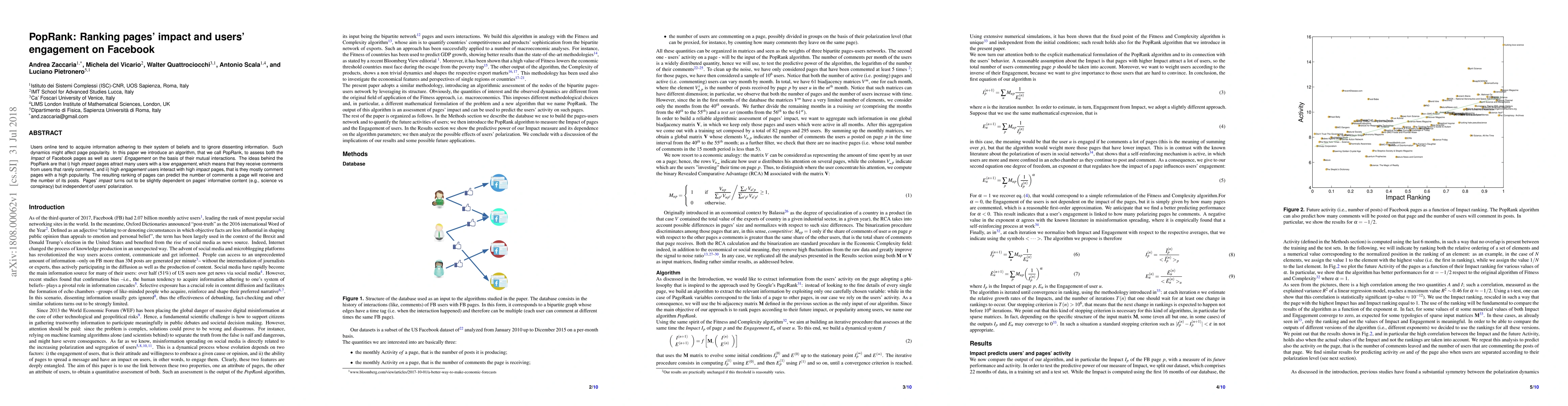 Users online tend to acquire information adhering to their system of beliefs and to ignore dissenting information. Such dynamics might affect page popularity. In this paper we introduce an algorithm, that we call PopRank, to assess both the Impact of Facebook pages as well as users' Engagement on the basis of their mutual interactions. The ideas behind the PopRank are that i) high impact pages attract many users with a low engagement, which means that they receive comments from users that rarely comment, and ii) high engagement users interact with high impact pages, that is they mostly comment pages with a high popularity. The resulting ranking of pages can predict the number of comments a page will receive and the number of its posts. Pages impact turns out to be slightly dependent on pages' informative content (e.g., science vs conspiracy) but independent of users' polarization.