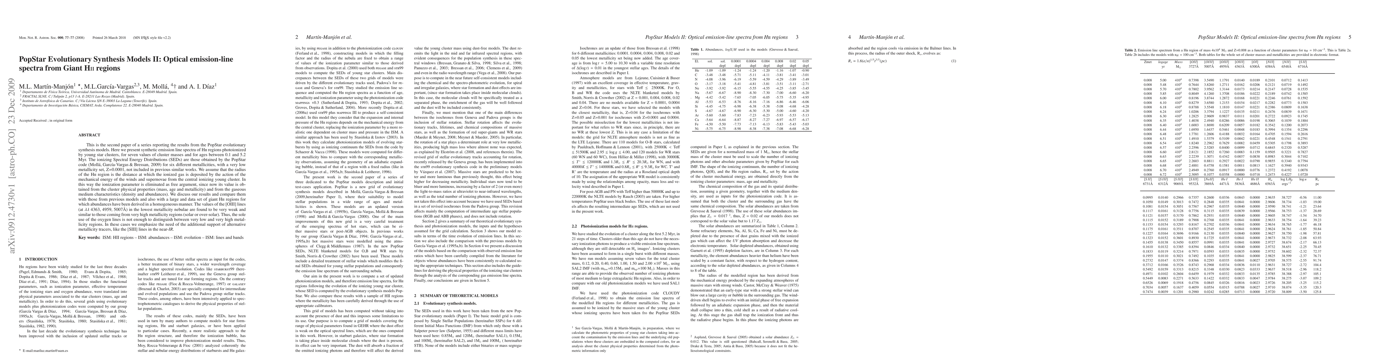 This is the second paper of a series reporting the results from the PopStar evolutionary synthesis models. Here we present synthetic emission line spectra of H{\sc ii} regions photoionized by young star clusters, for seven values of cluster masses and for ages between 0.1 and 5.2 Myr. The ionizing Spectral Energy Distributions (SEDs) are those obtained by the PopStar code \citep*{mgb09} for six different metallicities, with a very low metallicity set, Z=0.0001, not included in previous similar works. We assume that the radius of the H{\sc ii} region is the distance at which the ionized gas is deposited by the action of the mechanical energy of the winds and supernovae from the central ionizing young cluster. In this way the ionization parameter is eliminated as free argument, since now its value is obtained from the cluster physical properties (mass, age and metallicity) and from the gaseous medium characteristics (density and abundances). We discuss our results and compare them with those from previous models and also with a large and data set of giant H{\sc ii} regions for which abundances have been derived in a homogeneous manner. The values of the [OIII] lines (at $\lambda\lambda$ 4363, 4959, 5007\AA) in the lowest metallicity nebulae are found to be very weak and similar to those coming from very high metallicity regions (solar or over-solar). Thus, the sole use of the oxygen lines is not enough to distinguish between very low and very high metallicity regions. In these cases we emphasize the need of the additional support of alternative metallicity tracers, like the [SIII] lines in the near-\textit{IR}.