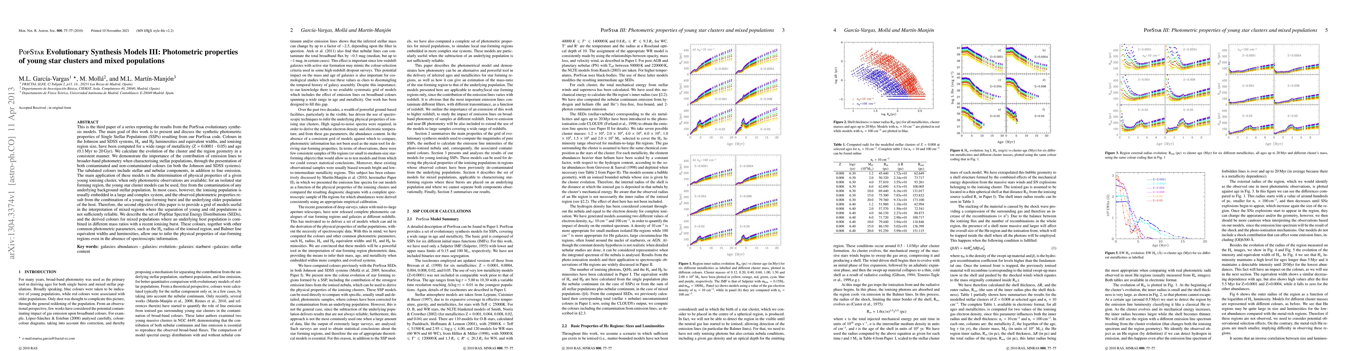 This is the third paper of a series reporting the results from the POPSTAR evolutionary synthesis models. The main goal of this work is to present and discuss the synthetic photometric properties of Single Stellar Populations (SSPs) resulting from our POPSTAR code. Colours in the Johnson and SDSS systems, halpha and hbeta luminosities and equivalent widths, and ionising region size, have been computed for a wide range of metallicity (Z = 0.0001 - 0.05) and age (0.1 Myr to 20 Gyr). We demonstrate the importance of the contribution of emission lines to broader-band photometry when characterising stellar populations, through the presentation of both contaminated and non-contaminated colours (in both the Johnson and SDSS systems). The tabulated colours include stellar and nebular components, in addition to line emission. The main application of these models is the determination of physical properties of a given young ionising cluster, when only photometric observations are available; for an isolated star forming region, the young star cluster models can be used, free from the contamination of any underlying background stellar population. In most cases, however, the ionising population is usually embedded in a large and complex system, and the observed photometric properties result from the combination of a young star-forming burst and the underlying older population of the host. Therefore, the second objective of this paper is to provide a grid of models useful in the interpretation of mixed regions where the separation of young and old populations is not sufficiently reliable. We describe the set of PopStar Spectral Energy Distributions, the derived colours and other photometric parameters, for mixed populations where an underlying host population is combined in different mass ratios with a recent ionising burst.