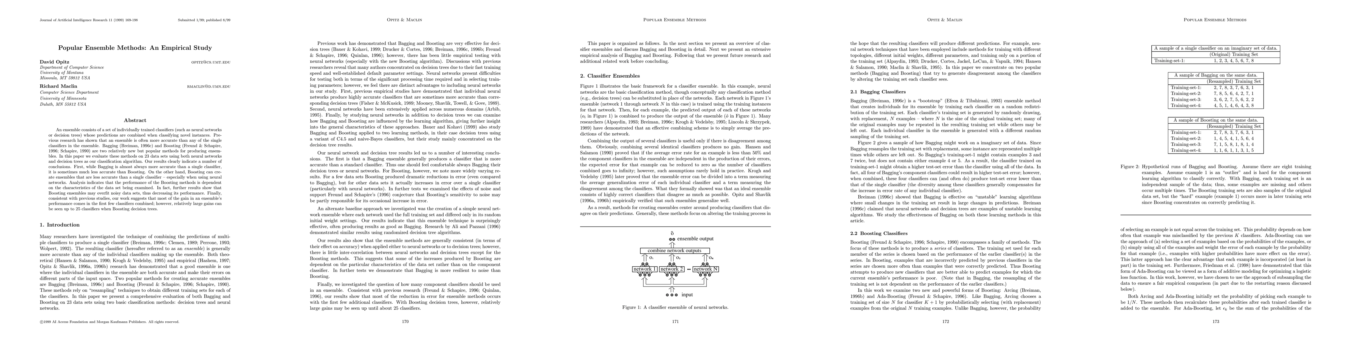 This study evaluates two popular ensemble methods (Bagging and Boosting) on 23 datasets using neural networks and decision trees, finding that Bagging is often more accurate but can be less accurate than Boosting in certain cases, with Boosting's performance dependent on data characteristics.