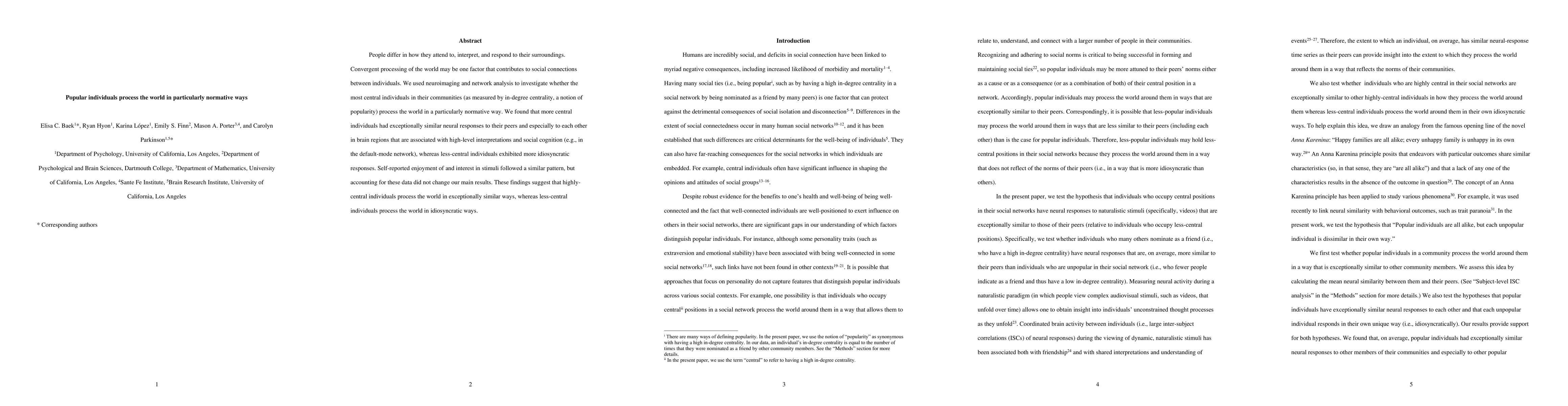 People differ in how they attend to, interpret, and respond to their surroundings. Convergent processing of the world may be one factor that contributes to social connections between individuals. We used neuroimaging and network analysis to investigate whether the most central individuals in their communities (as measured by in-degree centrality, a notion of popularity) process the world in a particularly normative way. We found that more central individuals had exceptionally similar neural responses to their peers and especially to each other in brain regions that are associated with high-level interpretations and social cognition (e.g., in the default-mode network), whereas less-central individuals exhibited more idiosyncratic responses. Self-reported enjoyment of and interest in stimuli followed a similar pattern, but accounting for these data did not change our main results. These findings suggest that highly-central individuals process the world in exceptionally similar ways, whereas less-central individuals process the world in idiosyncratic ways.