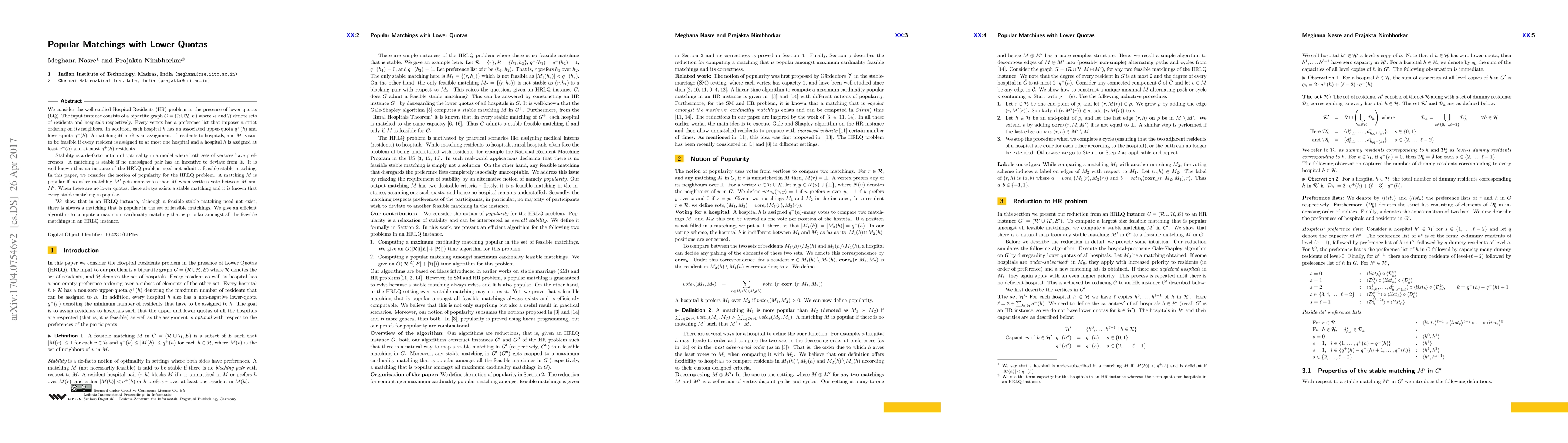 Researchers found that in a matching problem with lower quotas, there is always a popular matching among feasible matchings, even if no stable matching exists. An efficient algorithm can compute a maximum cardinality popular matching.