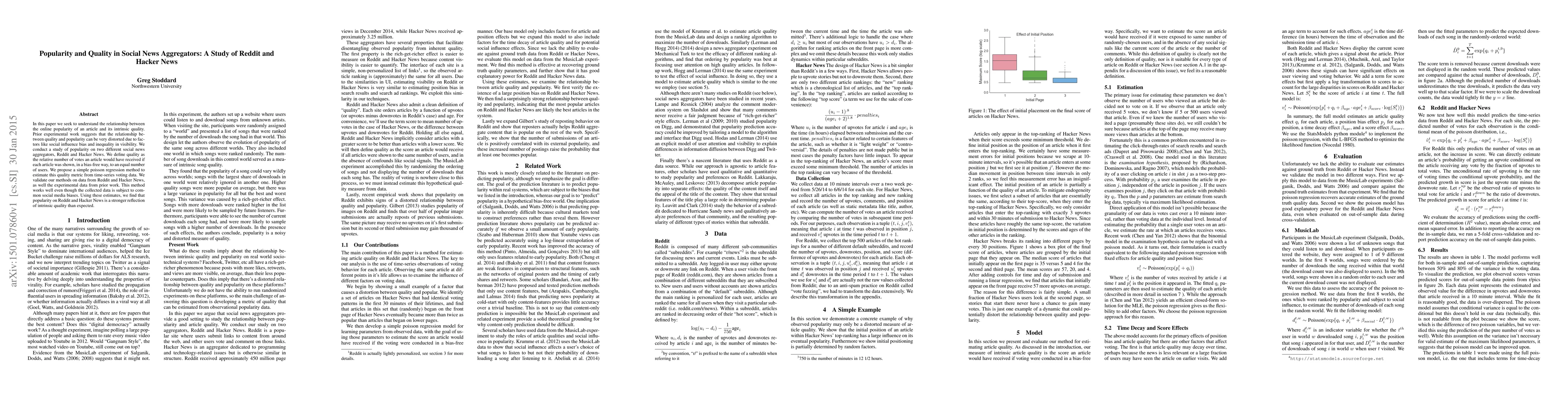 This study investigates the correlation between article popularity and intrinsic quality on Reddit and Hacker News, finding that despite social biases, both platforms tend to reflect article quality more accurately than anticipated. The researchers propose a Poisson regression method to estimate quality based on voting data, validating it against existing datasets.