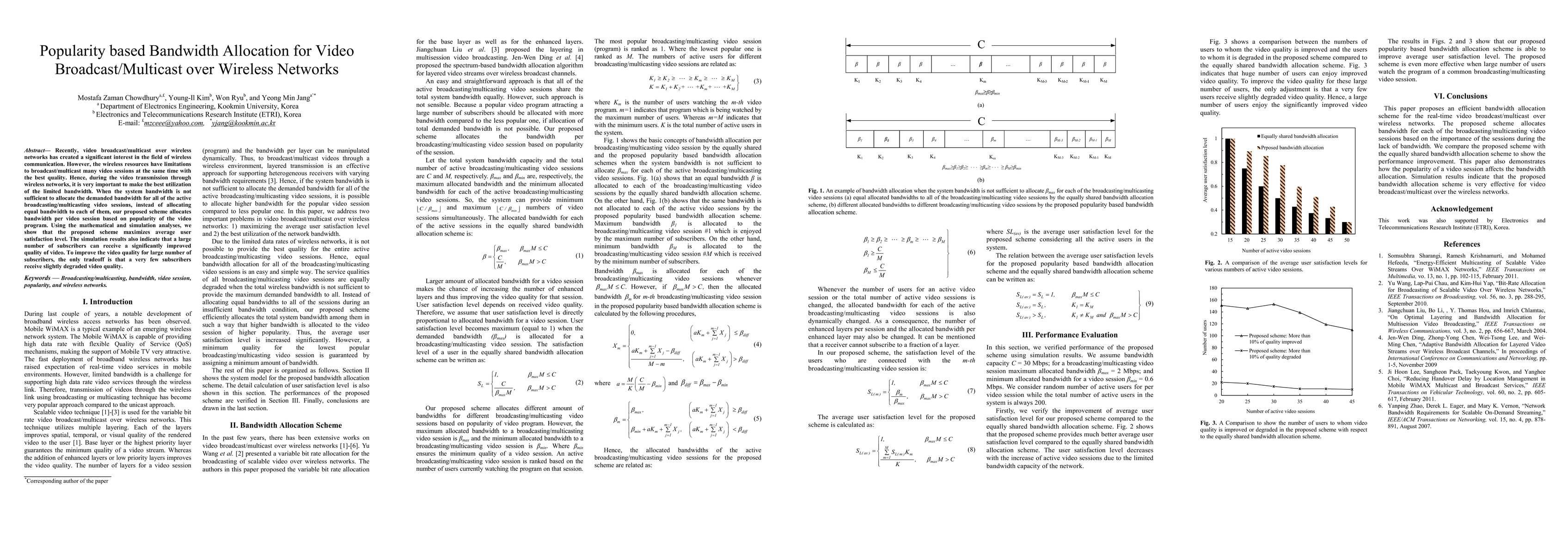 This paper proposes a bandwidth allocation scheme for video broadcast/multicast over wireless networks that prioritizes bandwidth allocation based on video program popularity. The scheme aims to maximize average user satisfaction by allocating bandwidth more efficiently, resulting in improved video quality for a larger number of subscribers at the expense of slightly degraded quality for a few.