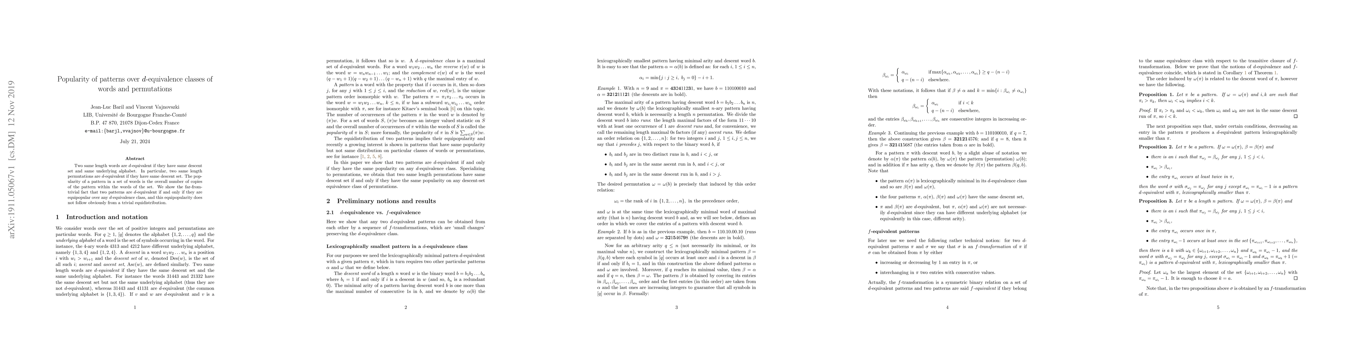 Two same length words are $d$-equivalent if they have same descent set and same underlying alphabet. In particular, two same length permutations are $d$-equivalent if they have same descent set. The popularity of a pattern in a set of words is the overall number of copies of the pattern within the words of the set. We show the far-from-trivial fact that two patterns are $d$-equivalent if and only if they are equipopular over any $d$-equivalence class, and this equipopularity does not follow obviously from a trivial equidistribution.