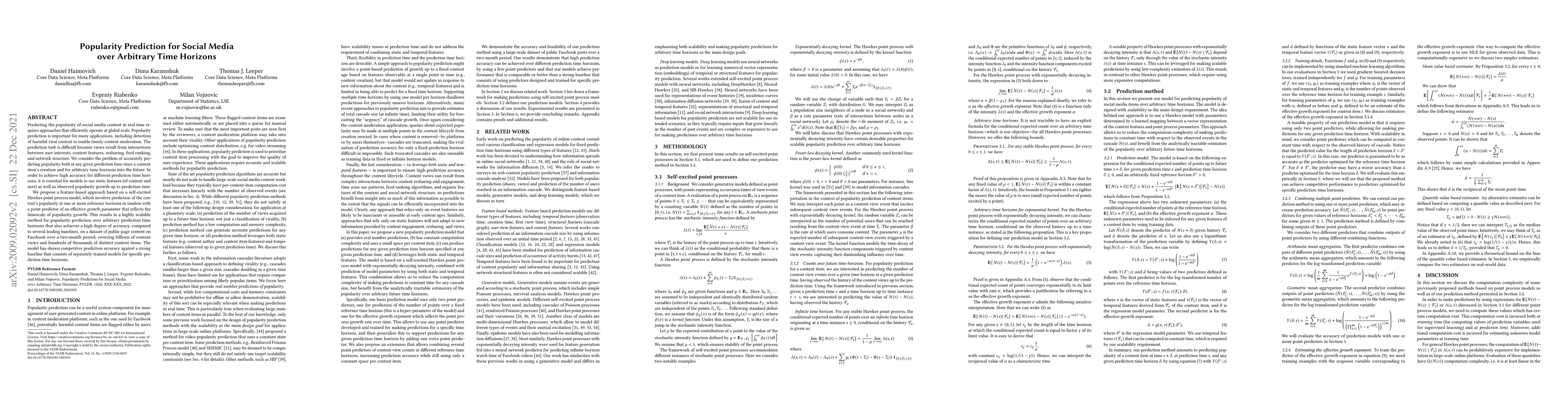 Predicting the popularity of social media content in real time requires approaches that efficiently operate at global scale. Popularity prediction is important for many applications, including detection of harmful viral content to enable timely content moderation. The prediction task is difficult because views result from interactions between user interests, content features, resharing, feed ranking, and network structure. We consider the problem of accurately predicting popularity both at any given prediction time since a content item's creation and for arbitrary time horizons into the future. In order to achieve high accuracy for different prediction time horizons, it is essential for models to use static features (of content and user) as well as observed popularity growth up to prediction time. We propose a feature-based approach based on a self-excited Hawkes point process model, which involves prediction of the content's popularity at one or more reference horizons in tandem with a point predictor of an effective growth parameter that reflects the timescale of popularity growth. This results in a highly scalable method for popularity prediction over arbitrary prediction time horizons that also achieves a high degree of accuracy, compared to several leading baselines, on a dataset of public page content on Facebook over a two-month period, covering billions of content views and hundreds of thousands of distinct content items. The model has shown competitive prediction accuracy against a strong baseline that consists of separately trained models for specific prediction time horizons.