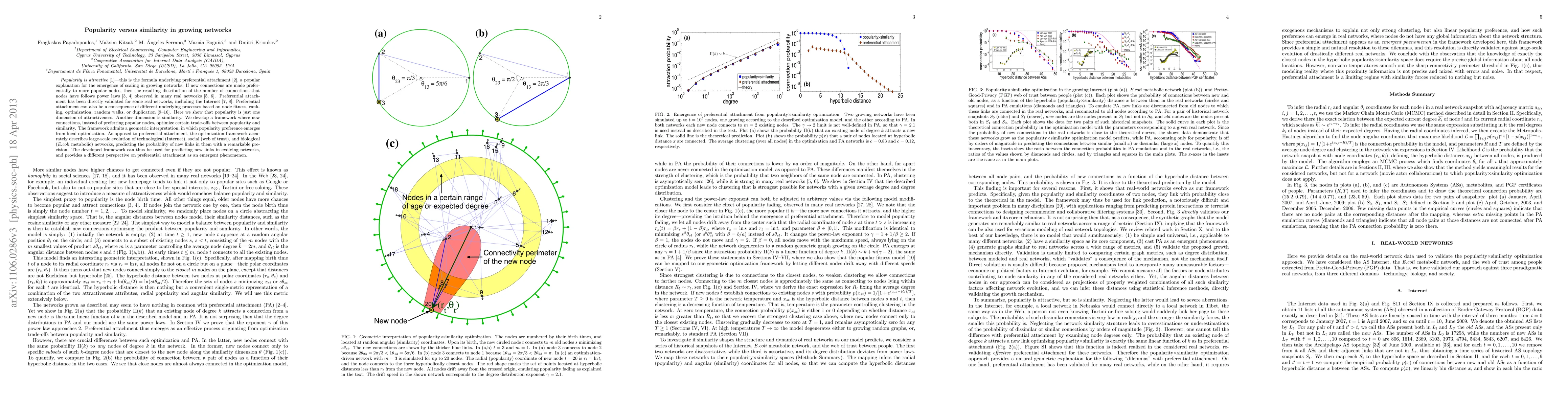 Popularity is attractive -- this is the formula underlying preferential attachment, a popular explanation for the emergence of scaling in growing networks. If new connections are made preferentially to more popular nodes, then the resulting distribution of the number of connections that nodes have follows power laws observed in many real networks. Preferential attachment has been directly validated for some real networks, including the Internet. Preferential attachment can also be a consequence of different underlying processes based on node fitness, ranking, optimization, random walks, or duplication. Here we show that popularity is just one dimension of attractiveness. Another dimension is similarity. We develop a framework where new connections, instead of preferring popular nodes, optimize certain trade-offs between popularity and similarity. The framework admits a geometric interpretation, in which popularity preference emerges from local optimization. As opposed to preferential attachment, the optimization framework accurately describes large-scale evolution of technological (Internet), social (web of trust), and biological (E.coli metabolic) networks, predicting the probability of new links in them with a remarkable precision. The developed framework can thus be used for predicting new links in evolving networks, and provides a different perspective on preferential attachment as an emergent phenomenon.