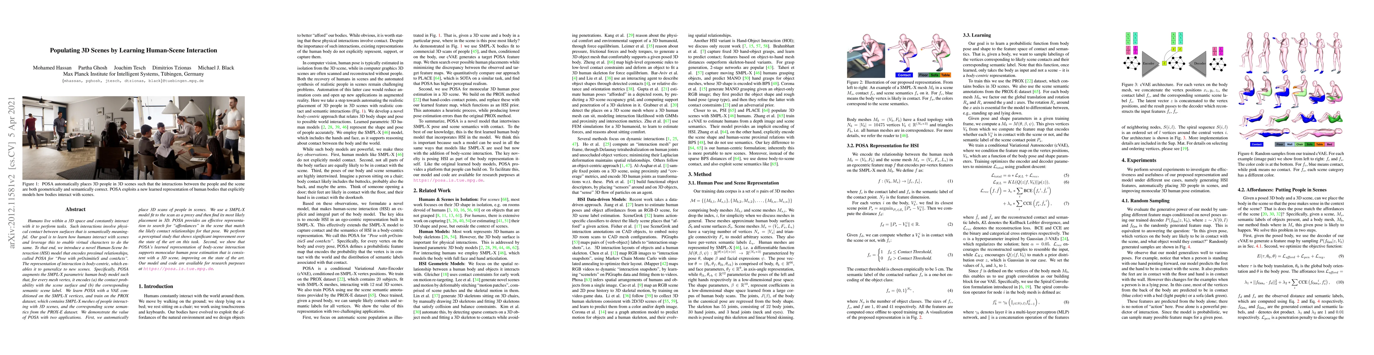 This paper introduces POSA, a novel Human-Scene Interaction model that encodes proximal relationships to represent how humans interact with 3D scenes. POSA augments the SMPL-X model to encode contact probabilities and semantic labels, enabling virtual characters to interact with new scenes. The model is trained on the PROX dataset and demonstrated to improve 3D human placement in scenes and monocular human pose estimation consistent with 3D context.