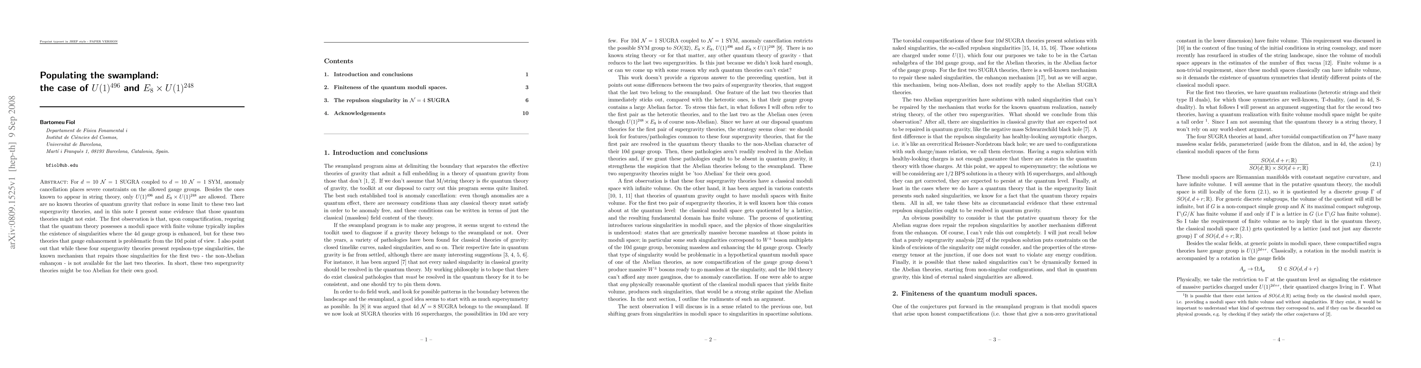 This paper explores two allowed gauge groups, U(1)^496 and E_8 x U(1)^248, in d=10 N=1 SUGRA coupled to d=10 N=1 SYM. It presents evidence suggesting that quantum theories reducing to these supergravity theories might not exist due to problematic gauge enhancements upon compactification and absence of a known mechanism to resolve repulson-type singularities.