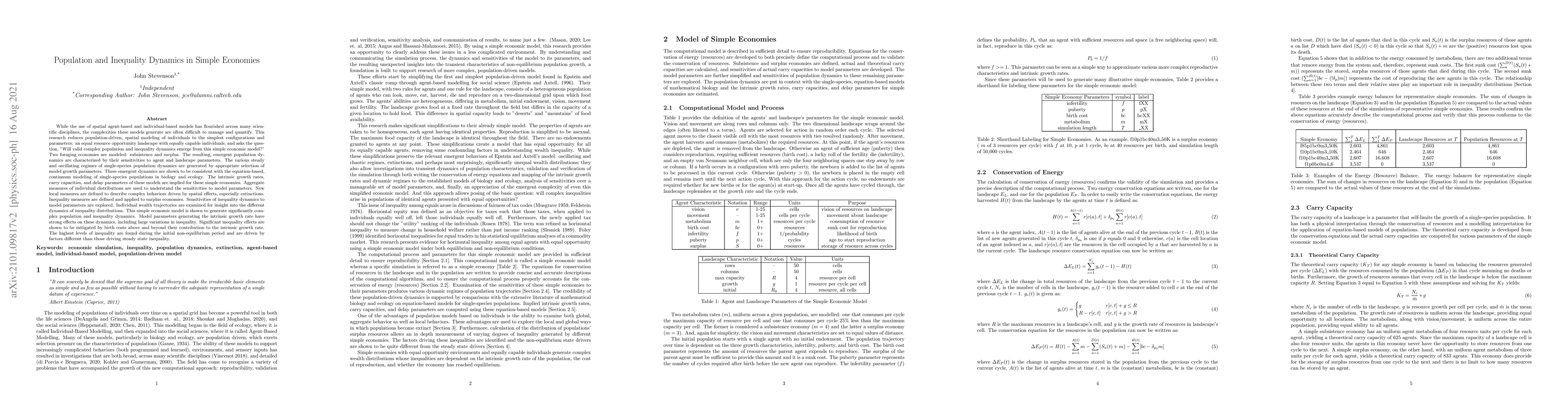 While the use of spatial agent-based and individual-based models has flourished across many scientific disciplines, the complexities these models generate are often difficult to manage and quantify. This research reduces population-driven, spatial modeling of individuals to the simplest configurations and parameters: an equal resource opportunity landscape with equally capable individuals; and asks the question, "Will valid complex population and inequality dynamics emerge from this simple economic model?" Two foraging economies are modeled: subsistence and surplus. The resulting, emergent population dynamics are characterized by their sensitivities to agent and landscape parameters. The various steady and oscillating regimes of single-species population dynamics are generated by appropriate selection of model growth parameters. These emergent dynamics are shown to be consistent with the equation-based, continuum modeling of single-species populations in biology and ecology. The intrinsic growth rates, carry capacities, and delay parameters of these models are implied for these simple economies. Aggregate measures of individual distributions are used to understand the sensitivities to model parameters. New local measures are defined to describe complex behaviors driven by spatial effects, especially extinctions. This simple economic model is shown to generate significantly complex population and inequality dynamics. Model parameters generating the intrinsic growth rate have strong effects on these dynamics, including large variations in inequality. Significant inequality effects are shown to be caused by birth costs above and beyond their contribution to the intrinsic growth rate. The highest levels of inequality are found during the initial non-equilibrium period and are driven by factors different than those driving steady state inequality.