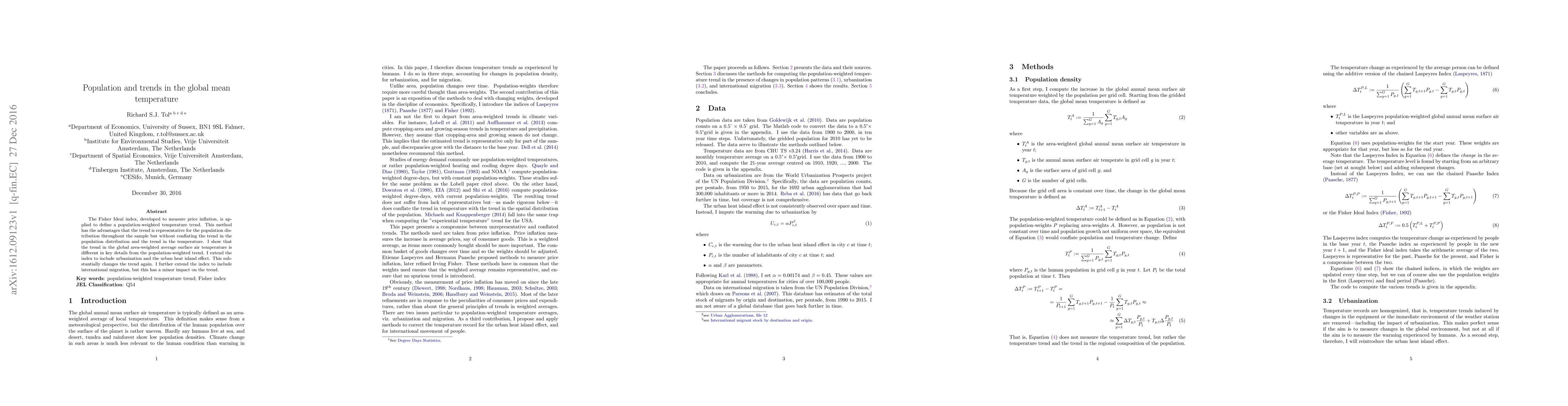 The Fisher Ideal index, developed to measure price inflation, is applied to define a population-weighted temperature trend. This method has the advantages that the trend is representative for the population distribution throughout the sample but without conflating the trend in the population distribution and the trend in the temperature. I show that the trend in the global area-weighted average surface air temperature is different in key details from the population-weighted trend. I extend the index to include urbanization and the urban heat island effect. This substantially changes the trend again. I further extend the index to include international migration, but this has a minor impact on the trend.
