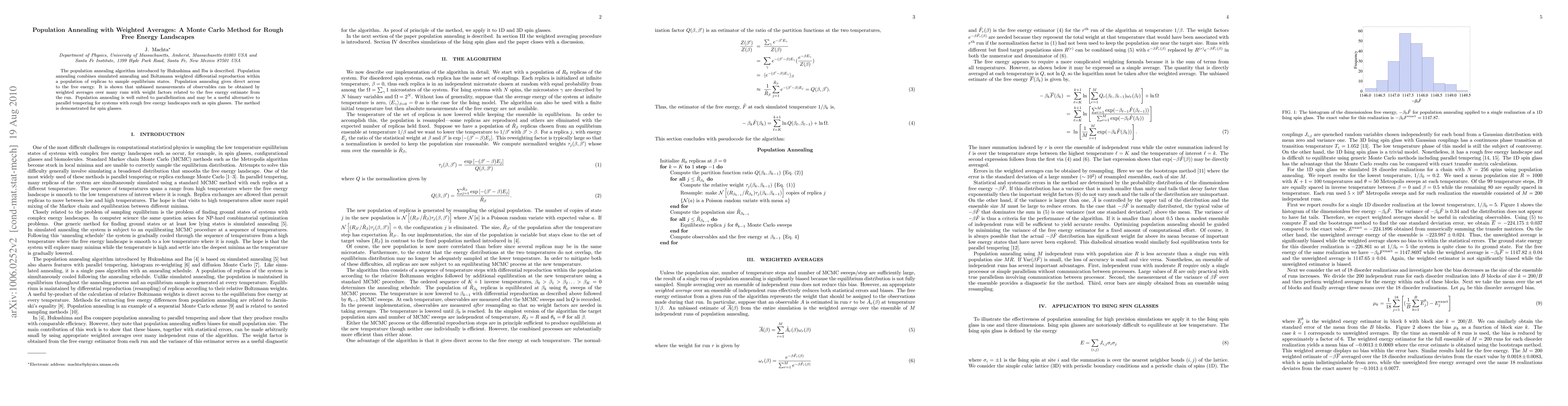 The population annealing algorithm combines simulated annealing and Boltzmann weighted reproduction to sample equilibrium states, providing direct access to the free energy and unbiased measurements via weighted averages. It is well-suited to parallelization and serves as an alternative to parallel tempering for systems with rough free energy landscapes, as demonstrated in spin glasses.