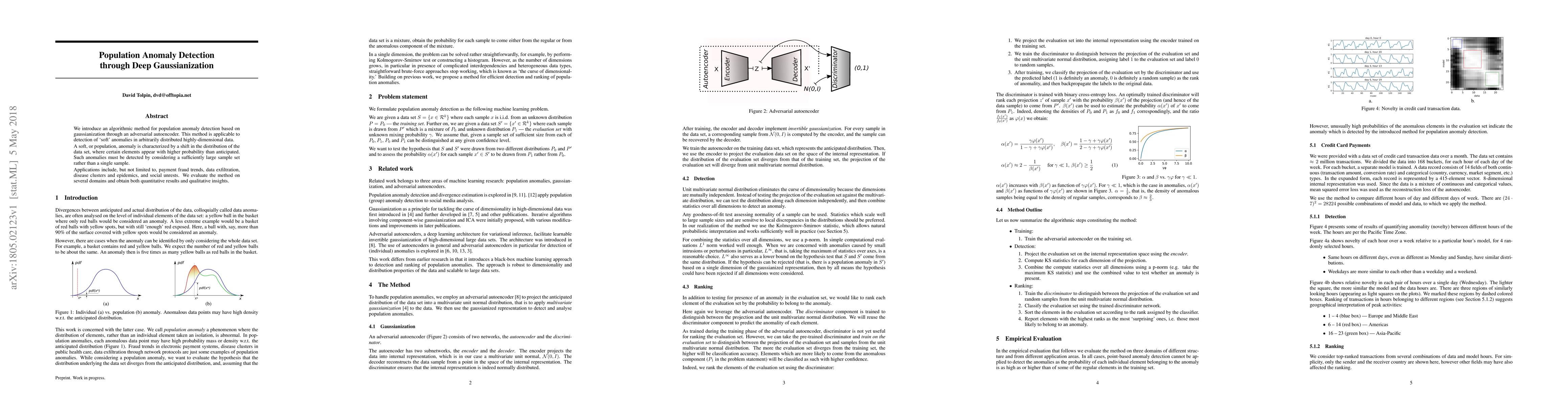 This paper proposes a novel deep learning method for detecting population anomalies via gaussianization using an adversarial autoencoder, applicable to high-dimensional data. The method identifies shifts in data distribution indicative of anomalies, with applications in fraud detection, disease clusters, and social unrest.