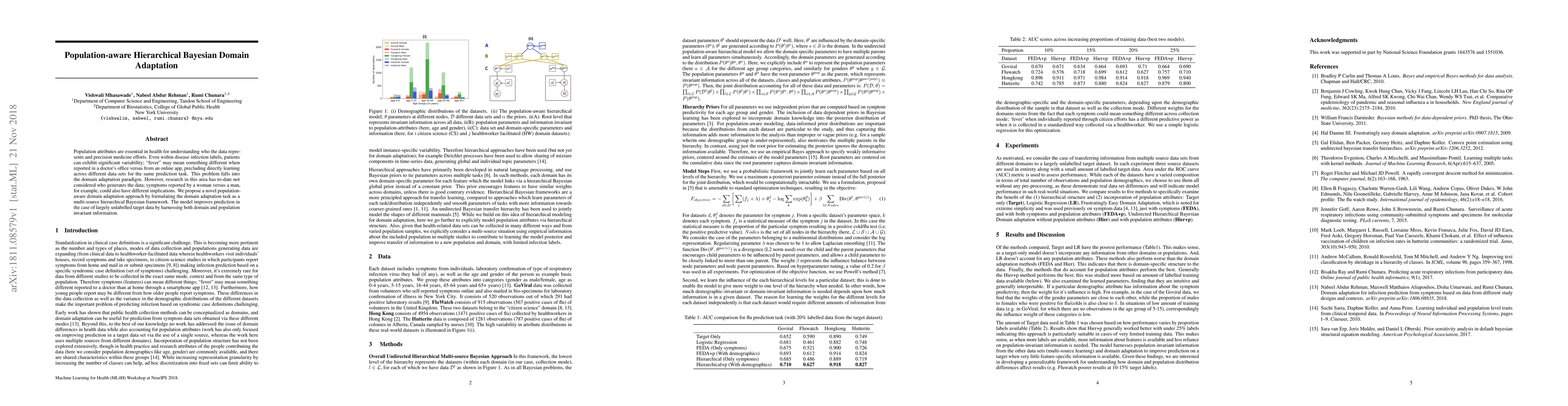 Population attributes are essential in health for understanding who the data represents and precision medicine efforts. Even within disease infection labels, patients can exhibit significant variability; "fever" may mean something different when reported in a doctor's office versus from an online app, precluding directly learning across different datasets for the same prediction task. This problem falls into the domain adaptation paradigm. However, research in this area has to-date not considered who generates the data; symptoms reported by a woman versus a man, for example, could also have different implications. We propose a novel population-aware domain adaptation approach by formulating the domain adaptation task as a multi-source hierarchical Bayesian framework. The model improves prediction in the case of largely unlabelled target data by harnessing both domain and population invariant information.