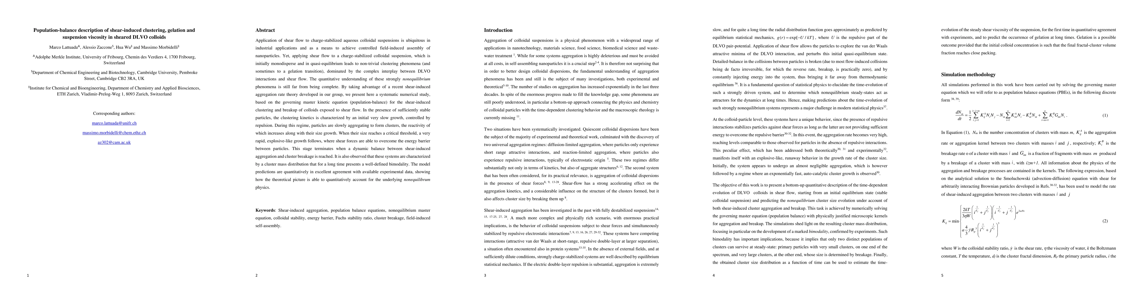 This paper presents a numerical study using a population-balance model to describe the shear-induced clustering and gelation in charge-stabilized colloidal suspensions under shear flow. The study reveals a bimodal cluster mass distribution and accurately predicts the kinetics of clustering and breakup, showing good agreement with experimental data.