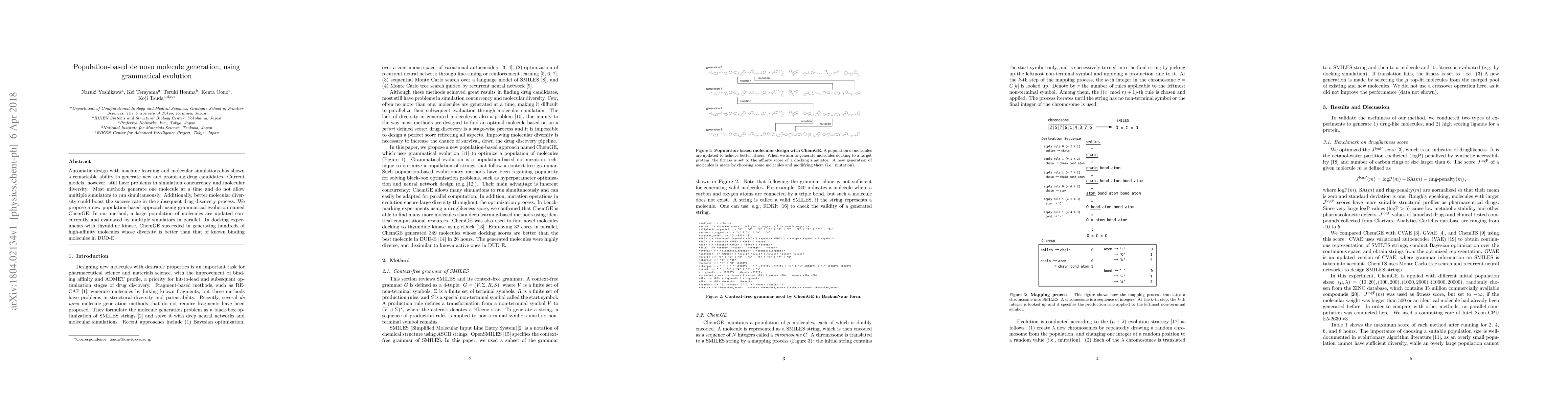 Automatic design with machine learning and molecular simulations has shown a remarkable ability to generate new and promising drug candidates. Current models, however, still have problems in simulation concurrency and molecular diversity. Most methods generate one molecule at a time and do not allow multiple simulators to run simultaneously. Additionally, better molecular diversity could boost the success rate in the subsequent drug discovery process. We propose a new population-based approach using grammatical evolution named ChemGE. In our method, a large population of molecules are updated concurrently and evaluated by multiple simulators in parallel. In docking experiments with thymidine kinase, ChemGE succeeded in generating hundreds of high-affinity molecules whose diversity is better than that of known inding molecules in DUD-E.