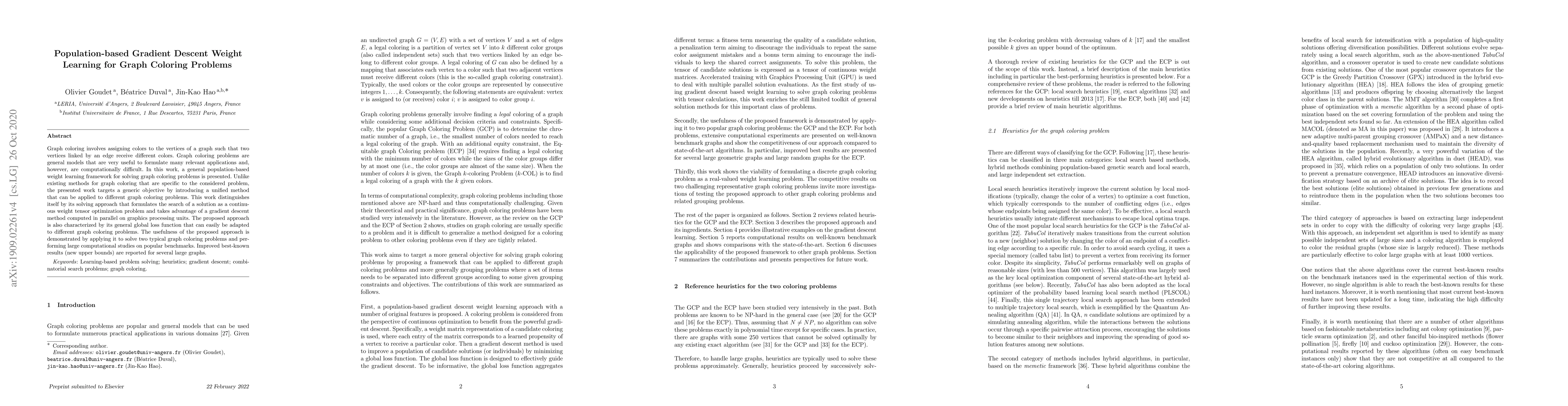 This research presents a population-based gradient descent framework for solving graph coloring problems using a continuous weight tensor optimization approach. The method demonstrates improved results on standard benchmarks and can be adapted to various graph coloring scenarios.