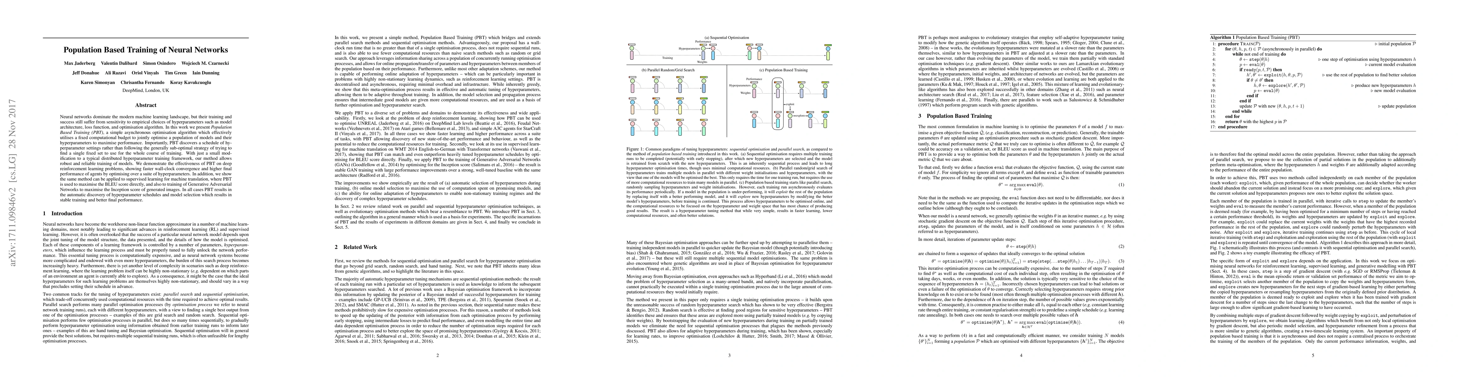 Population Based Training (PBT) optimizes both neural network models and hyperparameters simultaneously, discovering adaptive schedules instead of a single fixed set, leading to faster convergence and better performance across various tasks including deep reinforcement learning, machine translation, and GANs.