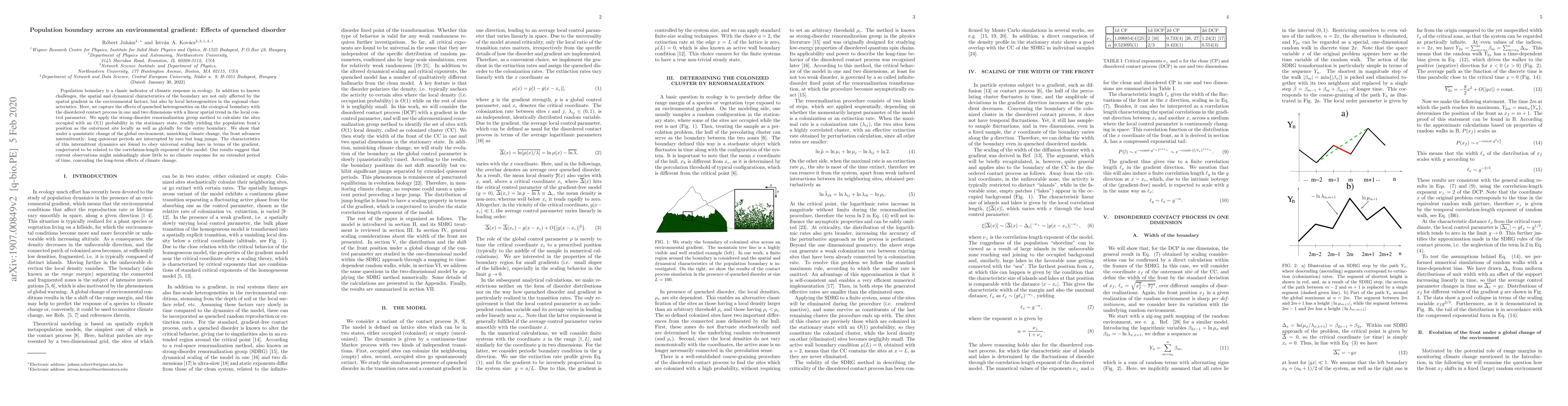 Population boundary is a classic indicator of climatic response in ecology. In addition to known challenges, the spatial and dynamical characteristics of the boundary are not only affected by the spatial gradient in the environmental factors, but also by local heterogeneities in the regional characteristics. Here, we capture the effects of quenched heterogeneities on the ecological boundary with the disordered contact process in one and two dimensions with a linear spatial trend in the local control parameter. We apply the strong-disorder renormalization group method to calculate the sites occupied with an $O(1)$ probability in the stationary state, readily yielding the population front's position as the outermost site locally as well as globally for the entire boundary. We show that under a quasistatic change of the global environment, mimicking climate change, the front advances intermittently: long quiescent periods are interrupted by rare but long jumps. The characteristics of this intermittent dynamics are found to obey universal scaling laws in terms of the gradient, conjectured to be related to the correlation-length exponent of the model. Our results suggest that current observations might misleadingly show little to no climate response for an extended period of time, concealing the long-term effects of climate change.