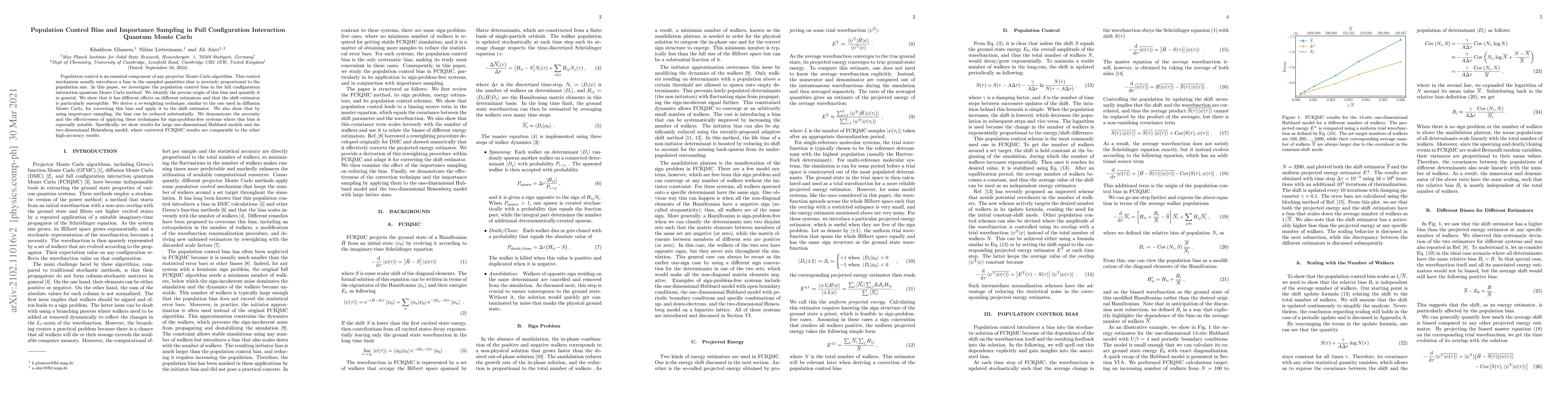 This paper investigates population control bias in full configuration interaction quantum Monte Carlo (FCIQMC), identifying its precise origin and quantifying its impact on different estimators, especially the shift estimator. It proposes a re-weighting technique and demonstrates that importance sampling can significantly reduce this bias, showcasing effective results on the one-dimensional Hubbard model and the two-dimensional Heisenberg model.