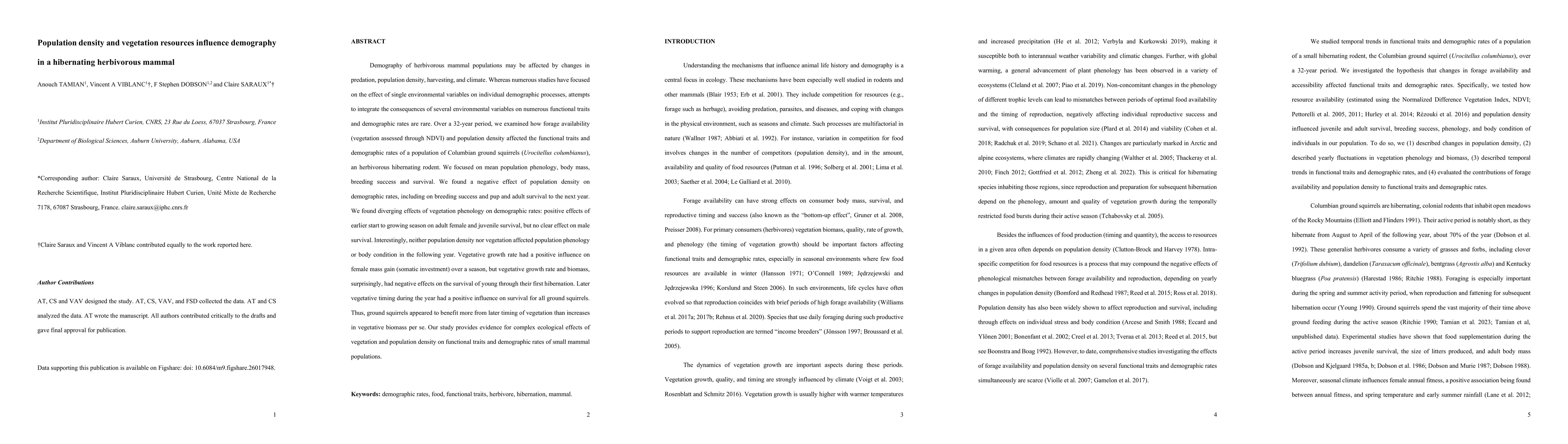 Demography of herbivorous mammal populations may be affected by changes in predation, population density, harvesting, and climate. Whereas numerous studies have focused on the effect of single environmental variables on individual demographic processes, attempts to integrate the consequences of several environmental variables on numerous functional traits and demographic rates are rare. Over a 32-year period, we examined how forage availability (vegetation assessed through NDVI) and population density affected the functional traits and demographic rates of a population of Columbian ground squirrels (Urocitellus columbianus), an herbivorous hibernating rodent. We focused on mean population phenology, body mass, breeding success and survival. We found a negative effect of population density on demographic rates, including on breeding success and pup and adult survival to the next year. We found diverging effects of vegetation phenology on demographic rates: positive effects of earlier start to growing season on adult female and juvenile survival, but no clear effect on male survival. Interestingly, neither population density nor vegetation affected population phenology or body condition in the following year. Vegetative growth rate had a positive influence on female mass gain (somatic investment) over a season, but vegetative growth rate and biomass, surprisingly, had negative effects on the survival of young through their first hibernation. Later vegetative timing during the year had a positive influence on survival for all ground squirrels. Thus, ground squirrels appeared to benefit more from later timing of vegetation than increases in vegetative biomass per se. Our study provides evidence for complex ecological effects of vegetation and population density on functional traits and demographic rates of small mammal populations.