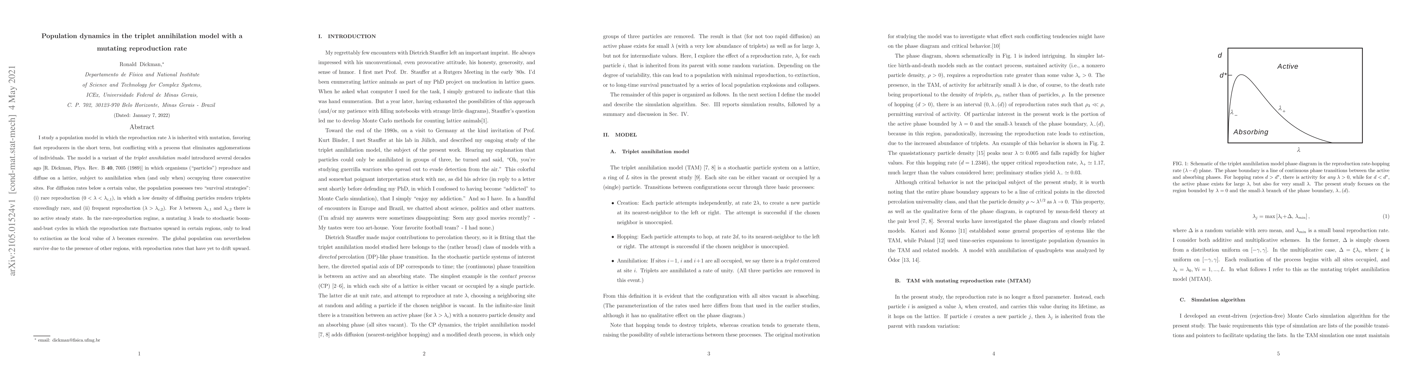 I study a population model in which the reproduction rate lambda is inherited with mutation, favoring fast reproducers in the short term, but conflicting with a process that eliminates agglomerations of individuals. The model is a variant of the triplet annihilation model introduced several decades ago [R. Dickman, Phys. Rev. B~{\bf 40}, 7005 (1989)] in which organisms ("particles") reproduce and diffuse on a lattice, subject to annihilation when (and only when) occupying three consecutive sites. For diffusion rates below a certain value, the population possesses two "survival strategies": (i) rare reproduction (0 < lambda < lambda_{c,1}), in which a low density of diffusing particles renders triplets exceedingly rare, and (ii) frequent reproduction (lambda > lambda_{c,2}). For lambda between lambda_{c,1} and lambda_{c,2} there is no active steady state. In the rare-reproduction regime, a mutating $\lambda$ leads to stochastic boom-and-bust cycles in which the reproduction rate fluctuates upward in certain regions, only to lead to extinction as the local value of lambda becomes excessive. The global population can nevertheless survive due to the presence of other regions, with reproduction rates that have yet to drift upward.