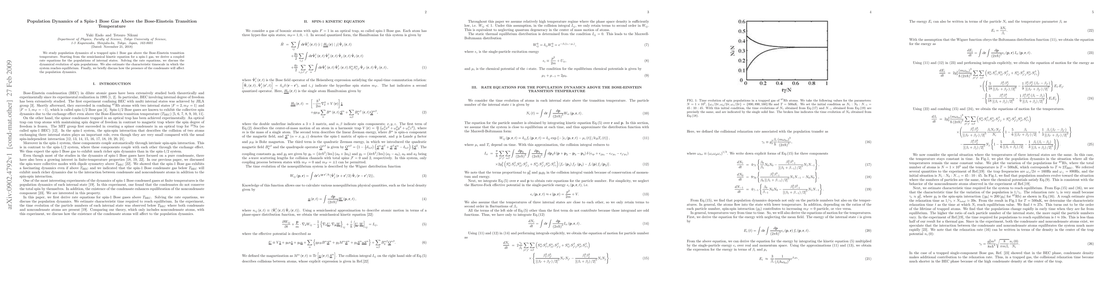 This paper investigates the population dynamics of a spin-1 Bose gas above the Bose-Einstein transition temperature, deriving coupled rate equations from a semiclassical kinetic model to analyze the evolution of spin populations and estimating the equilibrium timescale, while also considering the impact of the condensate on these dynamics.