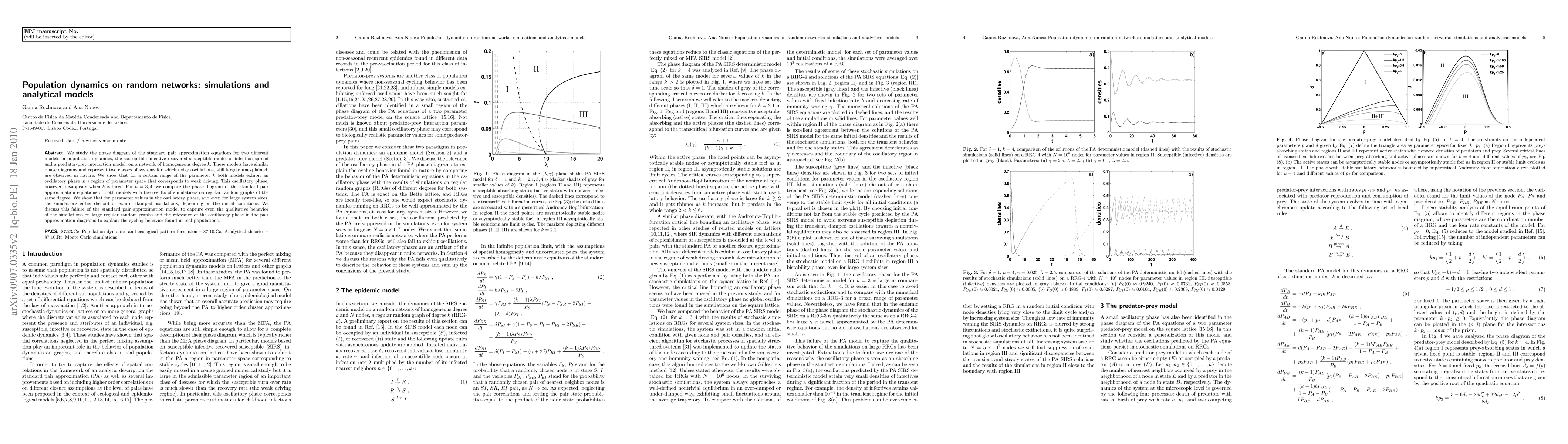 We study the phase diagram of the standard pair approximation equations for two different models in population dynamics, the susceptible-infective-recovered-susceptible model of infection spread and a predator-prey interaction model, on a network of homogeneous degree $k$. These models have similar phase diagrams and represent two classes of systems for which noisy oscillations, still largely unexplained, are observed in nature. We show that for a certain range of the parameter $k$ both models exhibit an oscillatory phase in a region of parameter space that corresponds to weak driving. This oscillatory phase, however, disappears when $k$ is large. For $k=3, 4$, we compare the phase diagram of the standard pair approximation equations of both models with the results of simulations on regular random graphs of the same degree. We show that for parameter values in the oscillatory phase, and even for large system sizes, the simulations either die out or exhibit damped oscillations, depending on the initial conditions. We discuss this failure of the standard pair approximation model to capture even the qualitative behavior of the simulations on large regular random graphs and the relevance of the oscillatory phase in the pair approximation diagrams to explain the cycling behavior found in real populations.