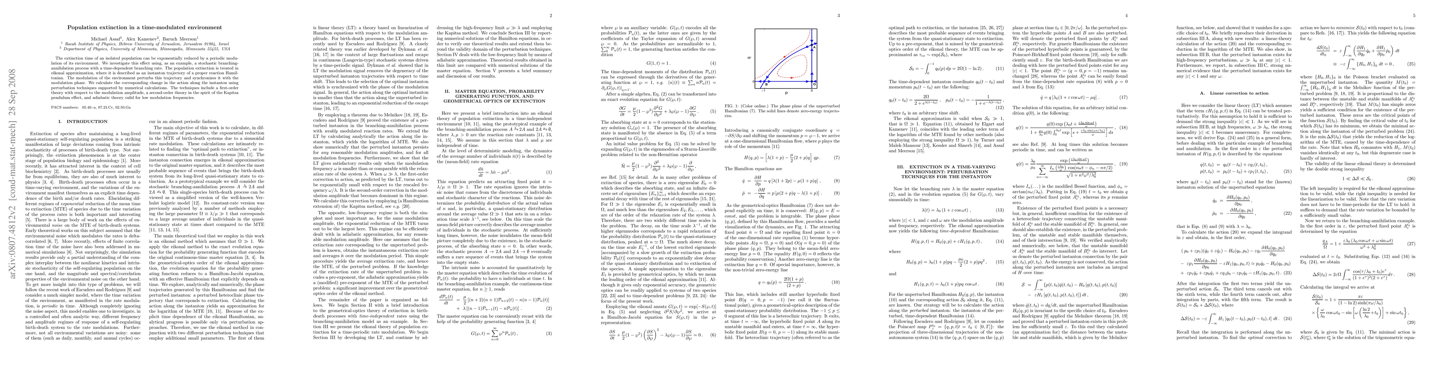 This paper explores how periodic environmental modulations can drastically shorten the extinction time of isolated populations, using a stochastic branching-annihilation process as a model. It employs eikonal approximation and instanton trajectories to describe the population dynamics, revealing synchronization effects with modulation phases.