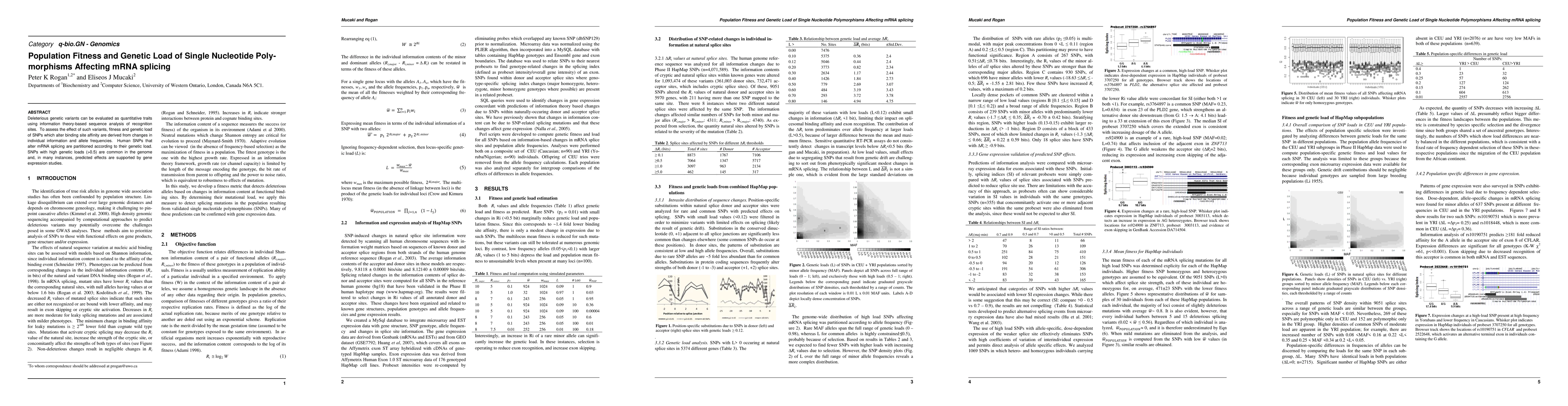 Deleterious genetic variants can be evaluated as quantitative traits using information theory-based sequence analysis of recognition sites. To assess the effect of such variants, fitness and genetic load of SNPs which alter binding site affinity are derived from changes in individual information and allele frequencies. Human SNPs that alter mRNA splicing are partitioned according to their genetic load. SNPs with high genetic loads (>0.5) are common in the genome and, in many instances, predicted effects are supported by gene expression studies.